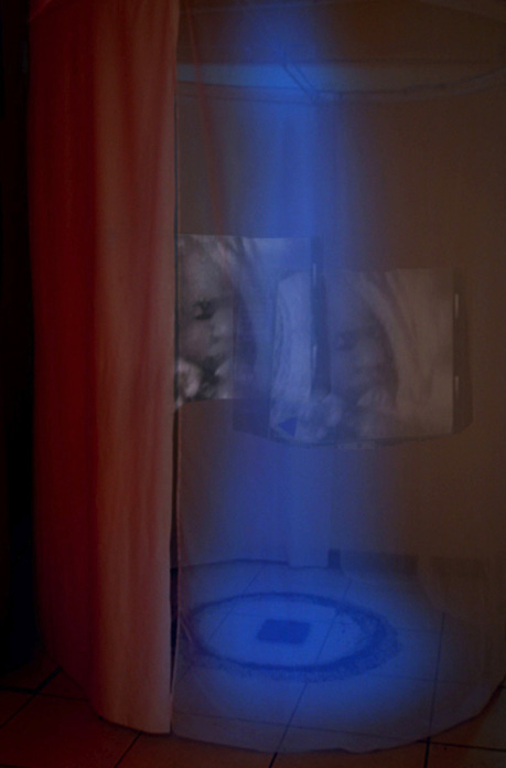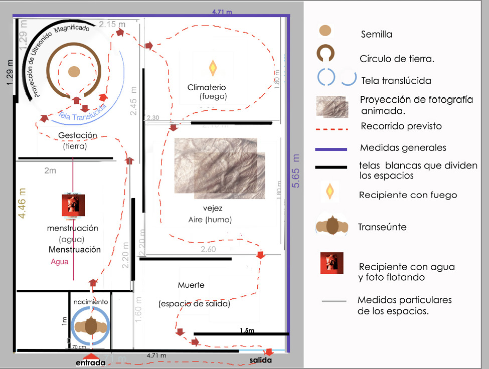 Se establecieron relaciones simbólicas con la bolsa embrionaria, el círculo, la semilla, el centro, el ombligo y el útero. El elemento cosmogónico asociado fue la tierra, el cual está vinculado con la polaridad de la vida en una gran cantidad de culturas. Por otra parte, el círculo también es una figura de gran potencia significativa, relacionado con la autoafirmación, la creación, el génesis, la tierra paridora y germinadora. Se ejecutó en el montaje un área redonda y translúcida, un gran útero, un lugar de espera a diferencia de la zona del nacimiento, que se concibiera como un sitio de tránsito. Este fue un espacio detenido, que se atravesaba pausadamente en forma circular, siendo esta la única manera en que se podría transitar, debido a su colocación y a la delimitación cuidadosa que se estableció. Se colocó, asimismo, un círculo de tierra y en el centro una semilla en un plato de color terroso. Bordeando estos elementos se instaló una tela transparente. Sobre esta tela, se proyectó la animación de un ultrasonido obstétrico con un ser en gestación, que se complementó con el sonido de un corazón. La proyección del feto provocó una sensación de ingravidez sobre la tela transparente (otra bolsa embrionaria). El espacio se coloreó de una luz azul puntiforme para remitir a los regímenes nocturnos que menciona Gilbert Durand.