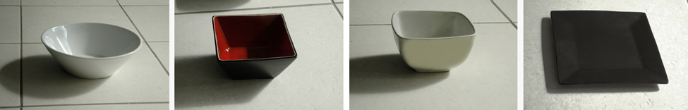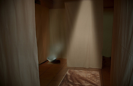 Se incorporó, de igual manera, la presencia real de estos elementos cosmogónicos en cada cubículo. Se colocó agua, tierra, fuego y aire; este último se hizo visible mediante humo (en el espacio en el que le correspondió). Pudo haberse utilizado la imagen fotográfica para representarlos, sin embargo, se dispuso ponerlos naturalmente para reforzar el carácter ritual de la pieza. Se utilizaron también, a lo largo de los módulos, diferentes recipientes de cerámica (por su constitución de tierra), los cuales se ubicaron en el piso para reforzar el carácter de la polaridad femenina de este elemento cosmogónico. El uso de los receptáculos tenían estrecha relación con el ámbito de especialización de mi maestría (diseño del espacio, la imagen y el producto) por la apropiación de objetos fabricados en serie. Ellos fueron re-semantizados o fetichizados, en una búsqueda retórica, para aprovechar su forma y color, en relación con el sentido comunicativo o representativo que necesitaba el espacio en cuestión y esta pieza artística en general.