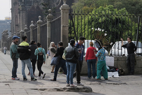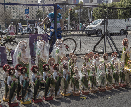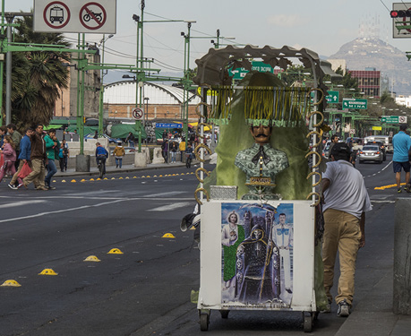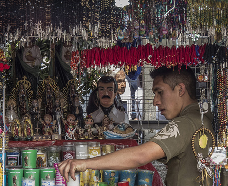 En otra ocasión, a un costado del Palacio de Bellas Artes, un personaje con una carretilla recorre la calle vendiendo objetos de protección y culto con la imagen de “Valverde” un narcotraficante muerto y beatificado popularmente (Fig.2). Con los ejemplos anteriores, se constata que estamos llenos e impregnados de esa doble existencia de la experiencia de lo físico y de lo simbólico, en un pensamiento mágico-religioso de un mundo presente y alterno a nosotros. Existe un realidad concreta, mediada por otra simbólica y mágica.