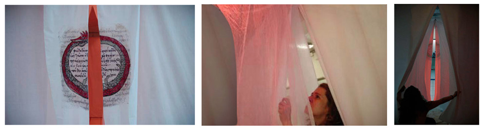 A partir de esta configuración de una pasaje con pequeñas estaciones constituidas en zonas rituales, relacionadas con cada período vital del cuerpo, se construye un espacio que trata de comunicar la sensación que puede transmitir un lugar de contemplación, a propósito del paradigma de la tranquilidad. Asimismo, se utilizó el color blanco para todo el interior de dicho espacio, como referente lunar y el recurso de tela para delimitar estos espacios, como un material cercano históricamente a lo femenino. También se contempló que cada aposento fuera interpretado por un elemento cosmogónico, este vinculado a una lógica ritual cercana al fenómeno vital que se estuviera trabajando.