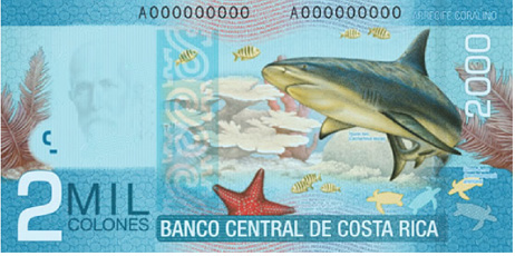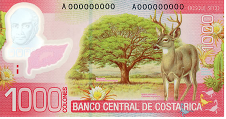 En cuanto al reverso de los billetes, la representación de diferentes hábitats o ecosistemas presentes de la biodiversidad costarricense evidencia la preocupación por mostrar en los billetes el actual motor de desarrollo económico: la biodiversidad costarricense, como generador del turismo. Se busca representar esta biodiversidad con el fin de explotar la imagen de Costa Rica en el entorno nacional y en el mundo como un destino exótico. Se retoman símbolos como el árbol de Guanacaste en el billete de 1 000 colones (también utilizado en otros productos gráficos como el logo del Instituto Nacional de Seguros), que representa la solidez y, a su vez, se trata de un símbolo patrio nacionalista, por ser el árbol nacional. Otro símbolo patrio es el venado, que se encuentra en ese mismo billete.