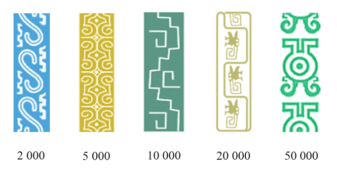 El elemento temático precolombino se retoma en el billete de 5 000 colones (Imagen 12), en el que se diseña un conjunto de biodiversidad y arte indígena, al recuperar en el diseño dos estatuillas precolombinas de oro y piedra, así como una esfera. Además, se retoma el recurso en los elementos decorativos presentes en las esquinas del billete. Cabe destacar que este billete, al igual que el de cinco colones, rompe con la simetría tradicional del diseño europeo, lo cual resulta también un recurso novedoso.