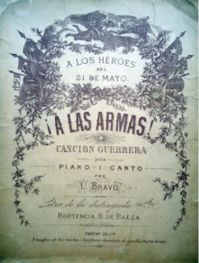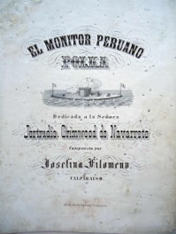 Un reciente proyecto de big data que consideró toda la edición chilena de música de salón dio como resultado que alrededor de un 10% de la creación del siglo XIX corresponde a creación femenina, pero más que eso, los tópicos utilizados en los títulos de las piezas compuestas por mujeres corresponden en su mayoría a la temática político-patriótica, superando incluso a la temática sentimental, que es la predominante en la época. Por ejemplo, la pieza ¡A las armas! Canción Guerrera, dedicada “A los héroes de Iquique” compuesta por I. Bravo, es otro ejemplo de autoría, con letra de Hortensia B. de Baeza (Aquí la poetisa también suprime su propio apellido para realzar el de su marido). Esta pieza contiene además otro paratexto donde, acorde con la construcción de género de la época, se realza el espíritu caritativo de las damas: “a beneficio de las viudas desvalidas de aquellos ilustres héroes”. Otro ejemplo semejante es la composición de Josefina Filomeno, quien crea y publica su polka El Monitor Peruano “Dedicada a la Señora Jertrudis Grimwood de Navarrete (ver imágenes 5 y 6 en la siguiente página)..