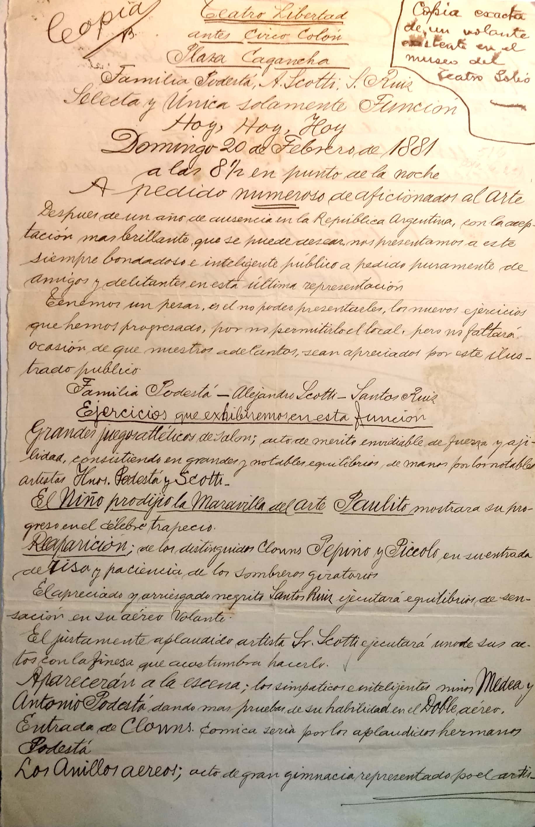 Jerónimo Podestá (1851-1923), tal como lo documenta de Diego, asistió a la escuela pública N° 26 en Uruguay, estudió música con el maestro Antonio Ferreyra (soplaba el pistón), formó un conjunto que bautizó Juventud Unida y actuaba en fiestas de la sociedad. Fue músico en el ejército uruguayo y, en 1872, comenzó en la ciudad de Montevideo sus actividades circenses junto a su hermano José en una carpa instalada en la calle 18 de julio. En 1873, contrajo matrimonio en Montevideo con Ana Viscaent, fallecida en Buenos Aires en 1918 y con quien tuvo cinco hijos: María, José, Francisco, Ana y Blanca (Imagen 1). Junto con la compañía de su hermano Pepe, realizó funciones circenses en Buenos Aires, Montevideo y Río de Janeiro. Luego de visitar esta última ciudad, se presentaron en el Circo Libertad de la Plaza Cagancha de Montevideo en 1881. Tal como se aprecia en la Imagen 2, la compañía Familia Podestá-Alejandro Scotti-Santos Ruiz realizó los siguientes ejercicios: “grandes juegos atléticos de salón, acto de mérito de fuerza y agilidad, consistiendo en grandes y notables equilibrios de mano por los notables artistas Podestá y Scotti”.