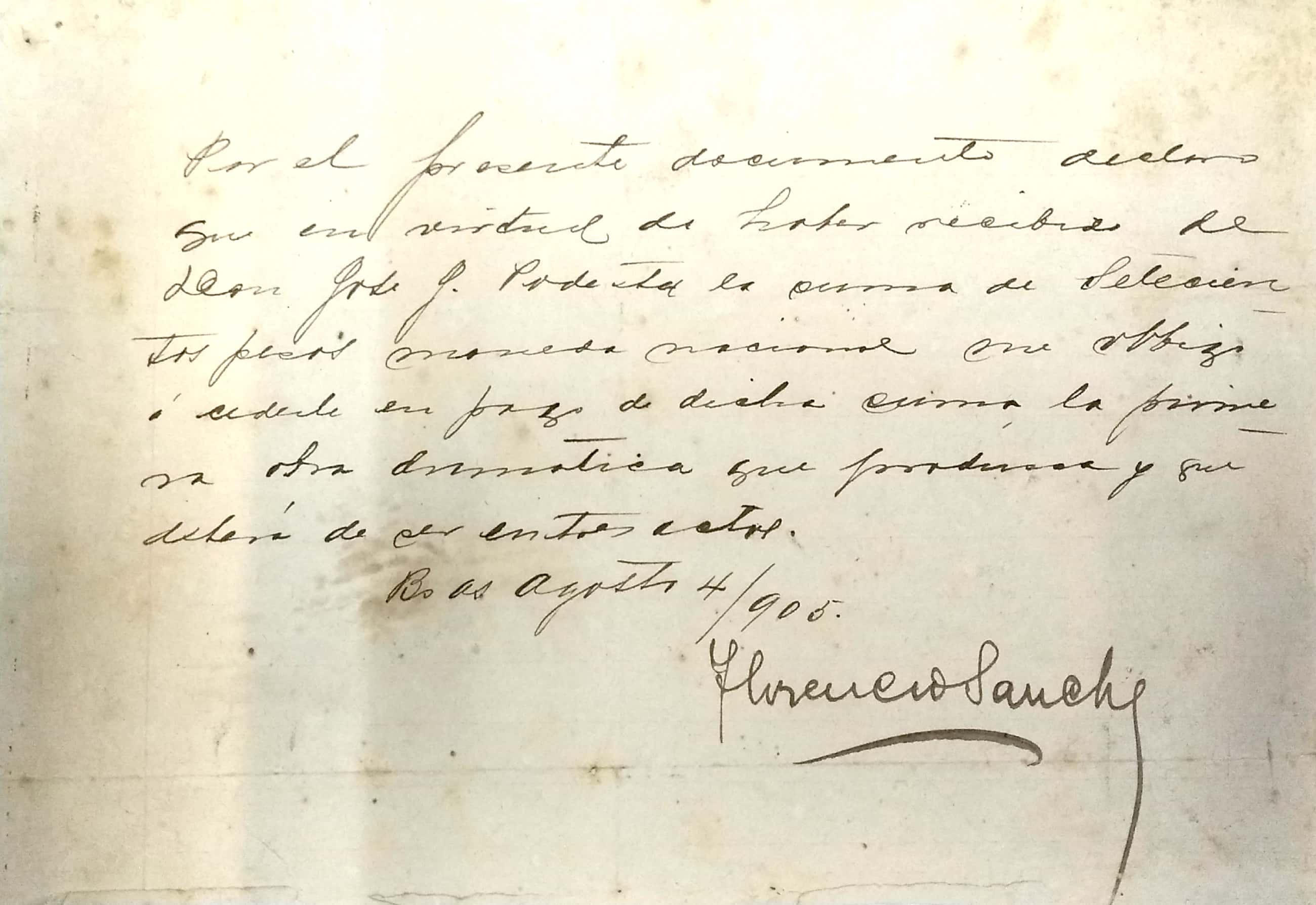 Durante esos años, tal como lo atestiguan las correspondencias mantenidas con el empresario Rafael Colombo (Archivo Manuscritos INET), la preocupación por el pago de los derechos de autores siempre estuvo presente en el actor y cabeza de compañía Pablo Podestá. En una carta fechada el 18 de noviembre de 1907, en la ciudad argentina de Santa Fe, se evidencian las tratativas por los derechos de las obras de Sánchez, así como de una obra próxima a estrenar: Facundo Quiroga. En otra carta (fechada por el INET en 1907 y destinada a Colombo), observamos no solo la organización interna de la compañía, los problemas de cartel con una de las actrices, sino también la planificación de la gira que se inició en Santa Fe y culminó en Córdoba. Entre los conflictos que articula la escritura de Pablo, es interesante señalar que en la carta da cuenta del fracaso económico de la obra Alma gaucha: “si bien gustó, no trae público, ha ido 3 veces. La primera noche hizo $800, la segunda $307 y la tercera fue domingo”. Asimismo, da indicaciones a los actores, ya que establece que no pueden estar entre bastidores y, una vez levantado el telón, “si se oye una palabra sea quien sea queda despedido de la compañía. Ya vez que mi disciplina es un consejo de guerra…”.
