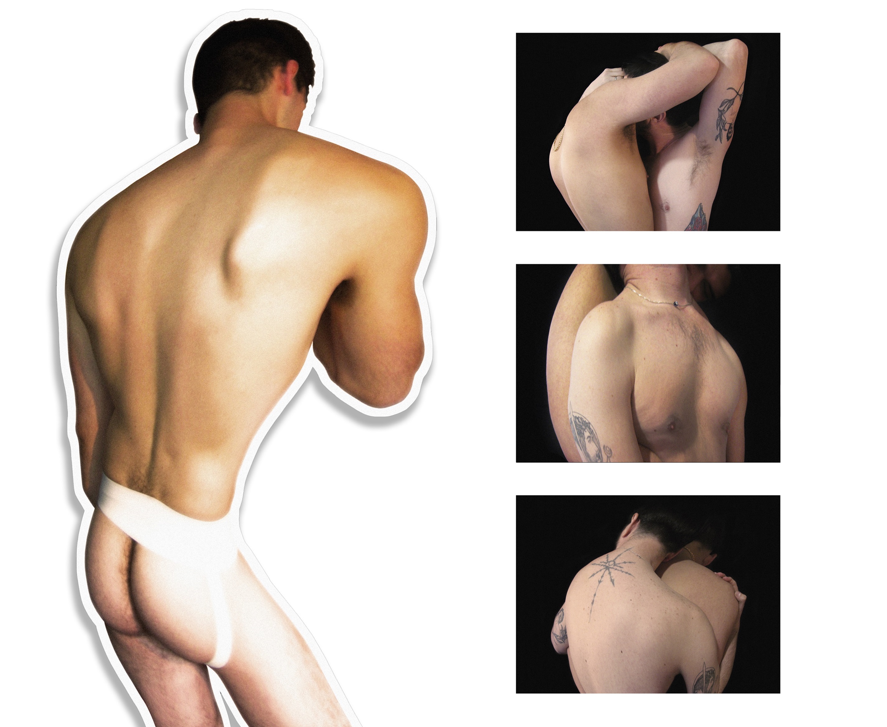 El protagonismo del cuerpo masculino parece sin duda el punto unificador más evidente entre los tres artistas y sus obras. Es pertinente destacar, por tanto, las distintas corporalidades que aparecen en la exposición y sus posibles significancias. Un aspecto que llama la atención es la persistencia en la representación de corporalidades jóvenes, blanco-mestizas, delgadas-tonificadas, que bien pueden unificarse bajo la catalogación de belleza masculina hegemónica. Son cuerpos cuya apariencia forma parte del canon actual del objeto de deseo que opera de forma masiva sobre personas de diversas orientaciones sexuales.