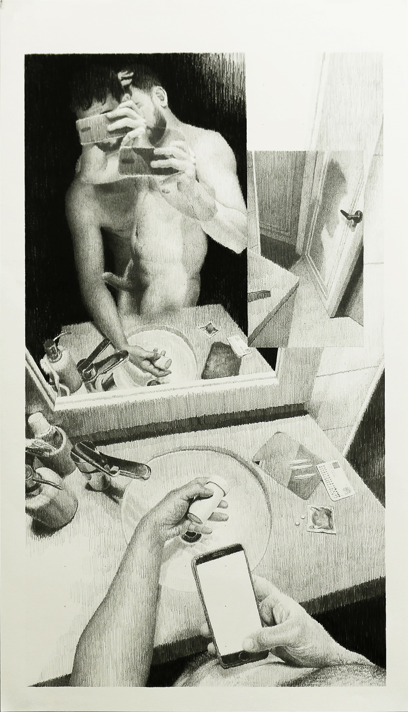 Es importante señalar que esta exposición asume conscientemente estas influencias: siguiendo los planteamientos de Perniola (2011), podemos decir que los autores apelan a una “estética del simulacro”, en el sentido de abrazar la realidad de las apariencias de forma creativa para activar, desde las codificaciones propias de la mediación técnica, imaginarios y especulaciones. En esta línea, cabe preguntarse –y en ello un pequeño placer morboso para quien visita la exposición– cuántos de los retratados han sido compañeros de aventuras sexuales de los propios artistas y en qué radica su interés de retratarlos, de detenerse en el recuerdo de esas pieles y esas formas. Es interesante esto porque, independientemente del tipo de formato –y del tipo de vínculo que estas personas hayan tenido con los artistas, haya sido casual, de una noche, relación afectiva, transa económica o incluso imaginario o voyeurismo digital–, hay una necesidad de hacer de ese encuentro un registro, de mostrarlo, de generar archivo y memoria, de compartir con otros (el público) la experiencia de esa corporalidad y esa otredad; remitir, en palabras de los artistas: