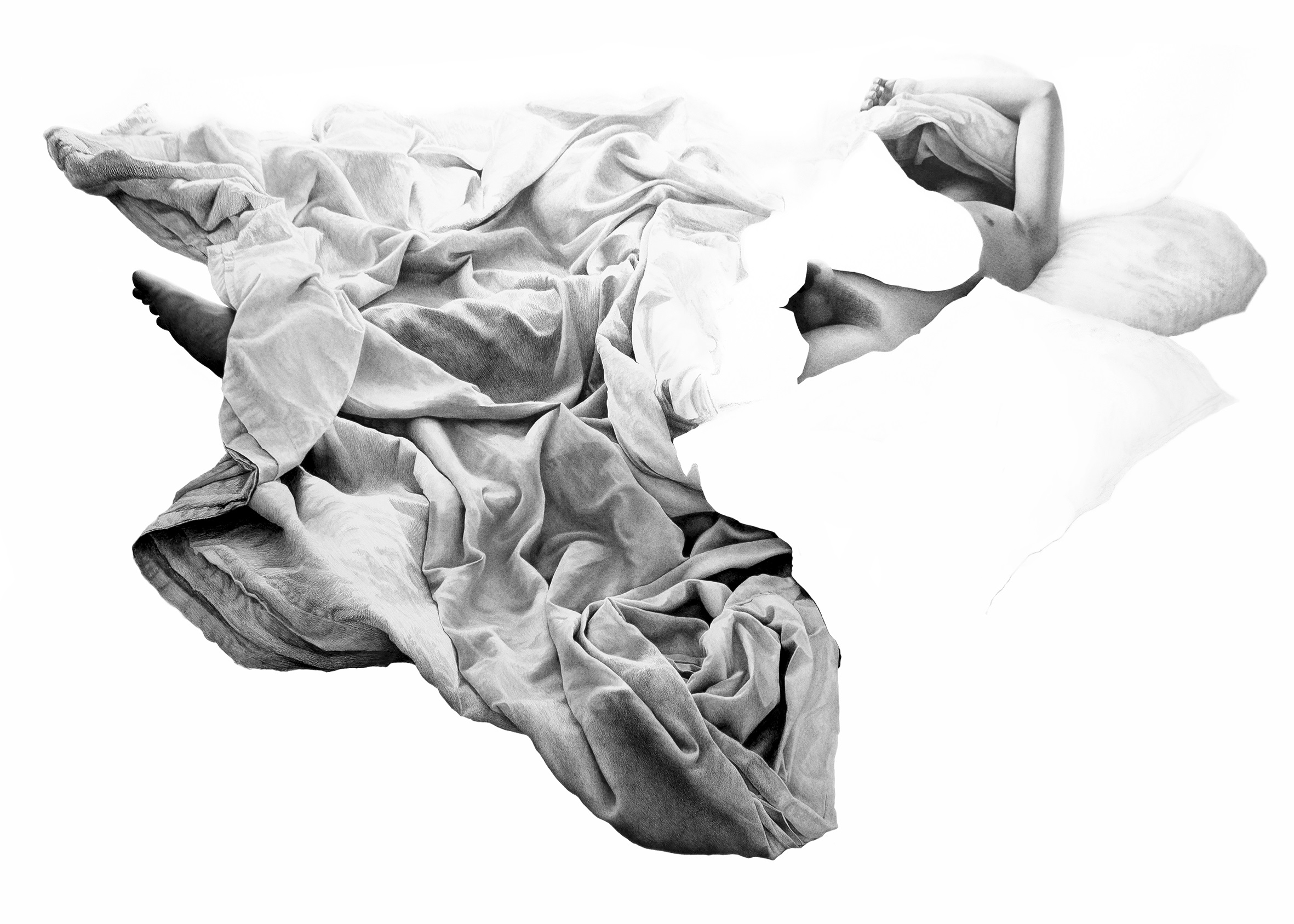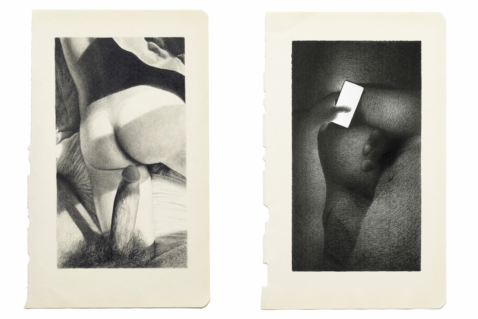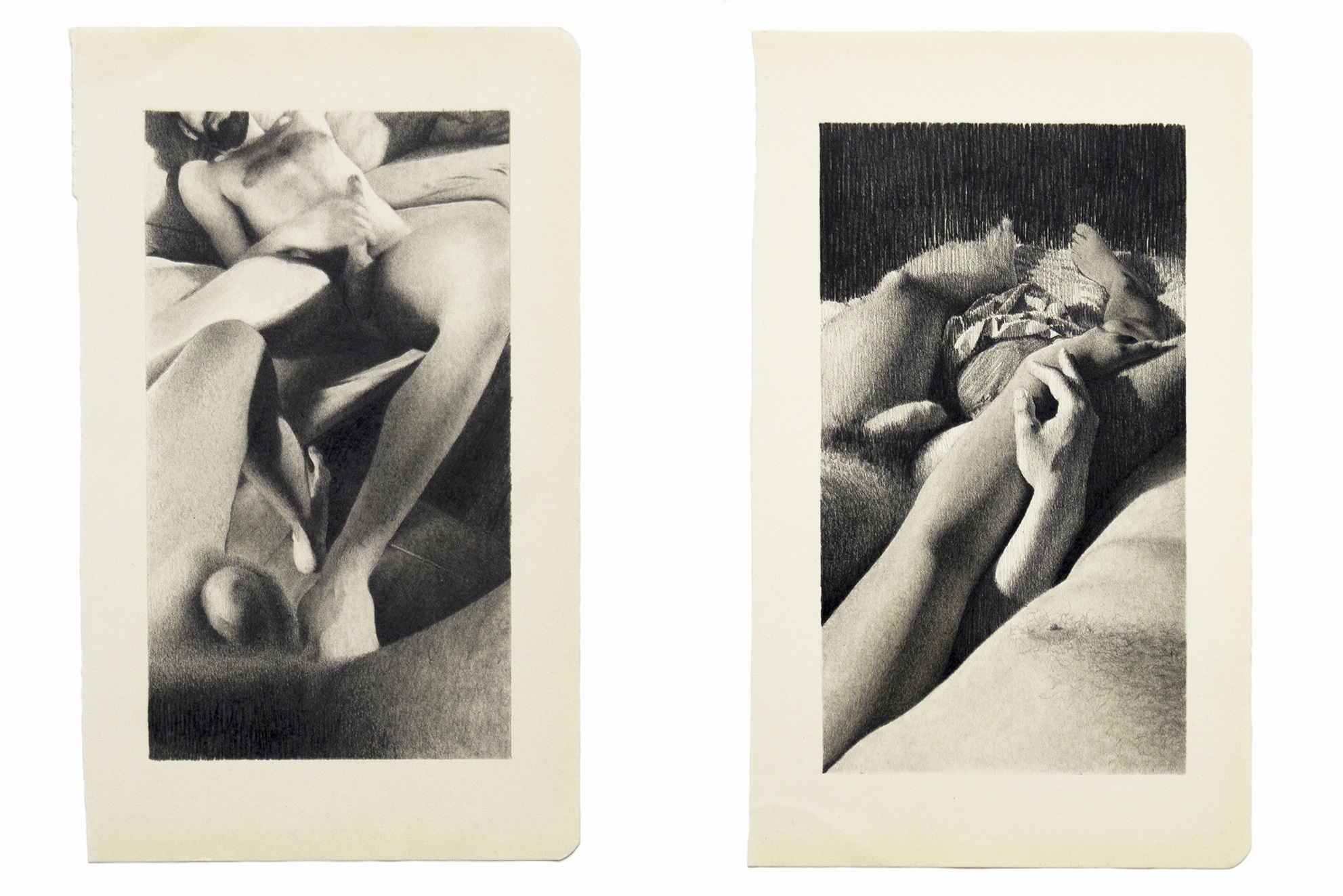 al acercarte descubres que no son fotografías sino dibujos fotorrealistas. Entonces aparece la cuestión de la pericia técnica: “parecen fotos” decía la gente sorprendida en la inauguración. Pero yo diría que ese fotorrealismo es en realidad un segundo señuelo, esta vez, del dibujo. No solo porque algunos de los dibujos fotorrealistas están “inconclusos” o se aprecia claramente el gesto manual, sino que incluso en los más fotorrealistas, al mirarlos de cerca, es posible percibir la compleja estructura de su configuración por tramas o develando inesperadas construcciones circulares. Se podría calificar a estos dibujos como “post pornográficos”, justamente por la presencia de esta secuencia de señuelos: primero el porno, luego el fotorrealismo y finalmente el dibujo. (F. Rivas San Martín, comunicación personal, 28 de diciembre del 2022)