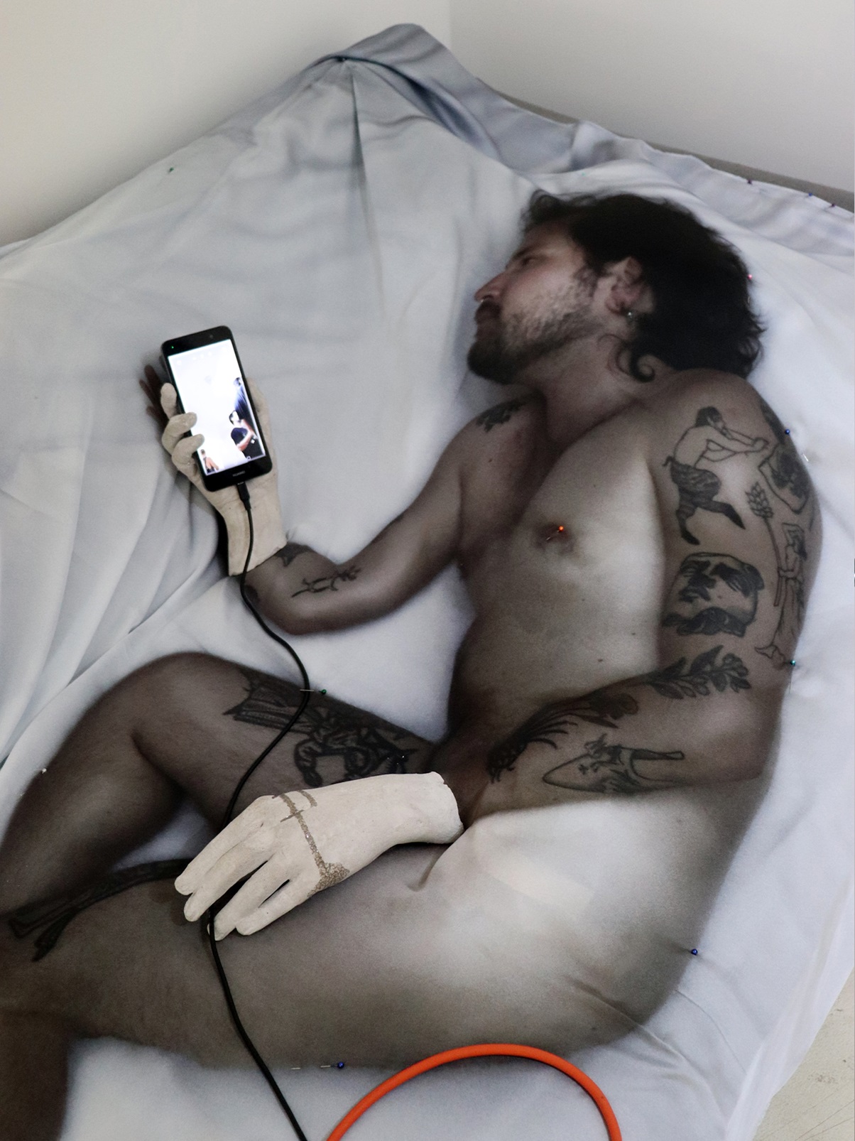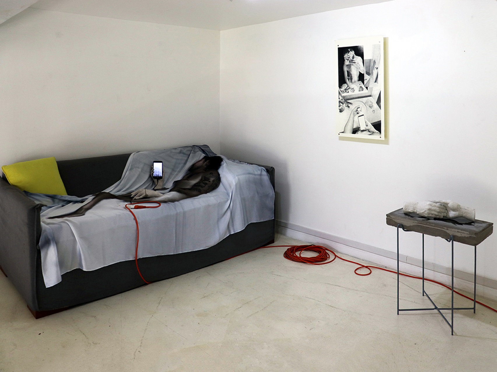 Finalmente, en un segundo piso de la galería, está la instalación colectiva site specific de los tres artistas, titulada “C/L con lugar” y presentada en la Figura 5 y la Figura 6. En esta, se halla una tela, dispuesta sobre un sillón preexistente en la galería que tiene la imagen de un sujeto desnudo acostado que mira un teléfono móvil, dispositivo que se expone en su materialidad concreta en efecto espejo (la persona espectadora puede “mirarse” en ella) y cuyas manos son nuevamente esculturas.
