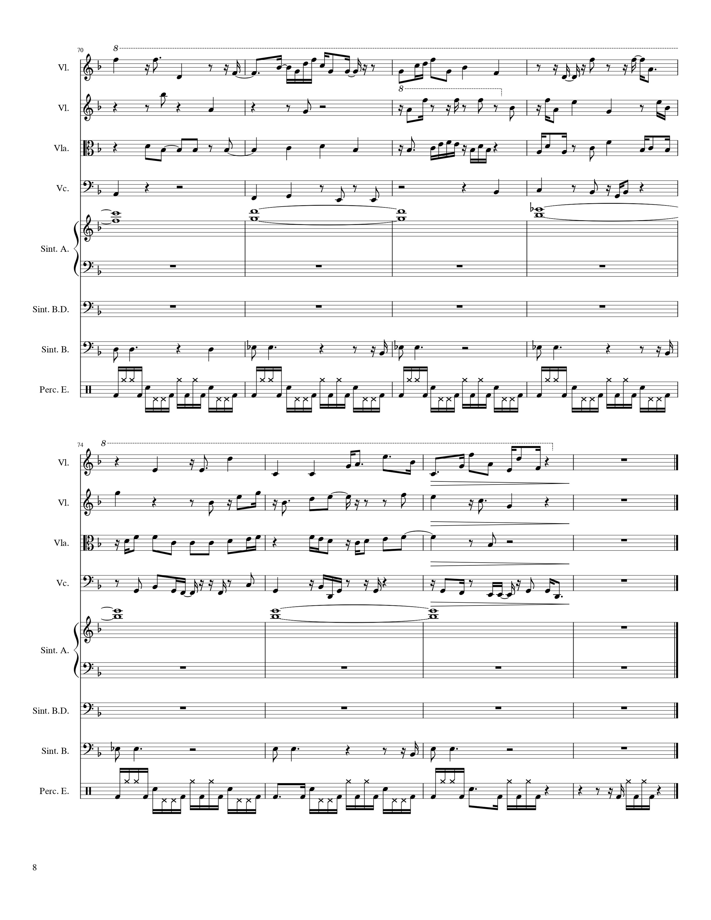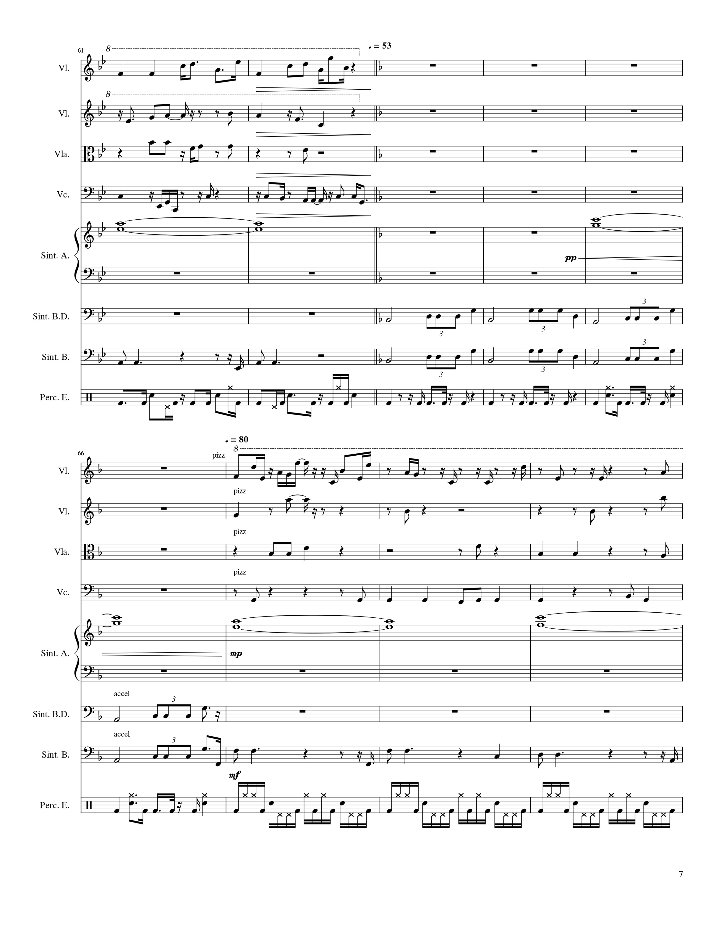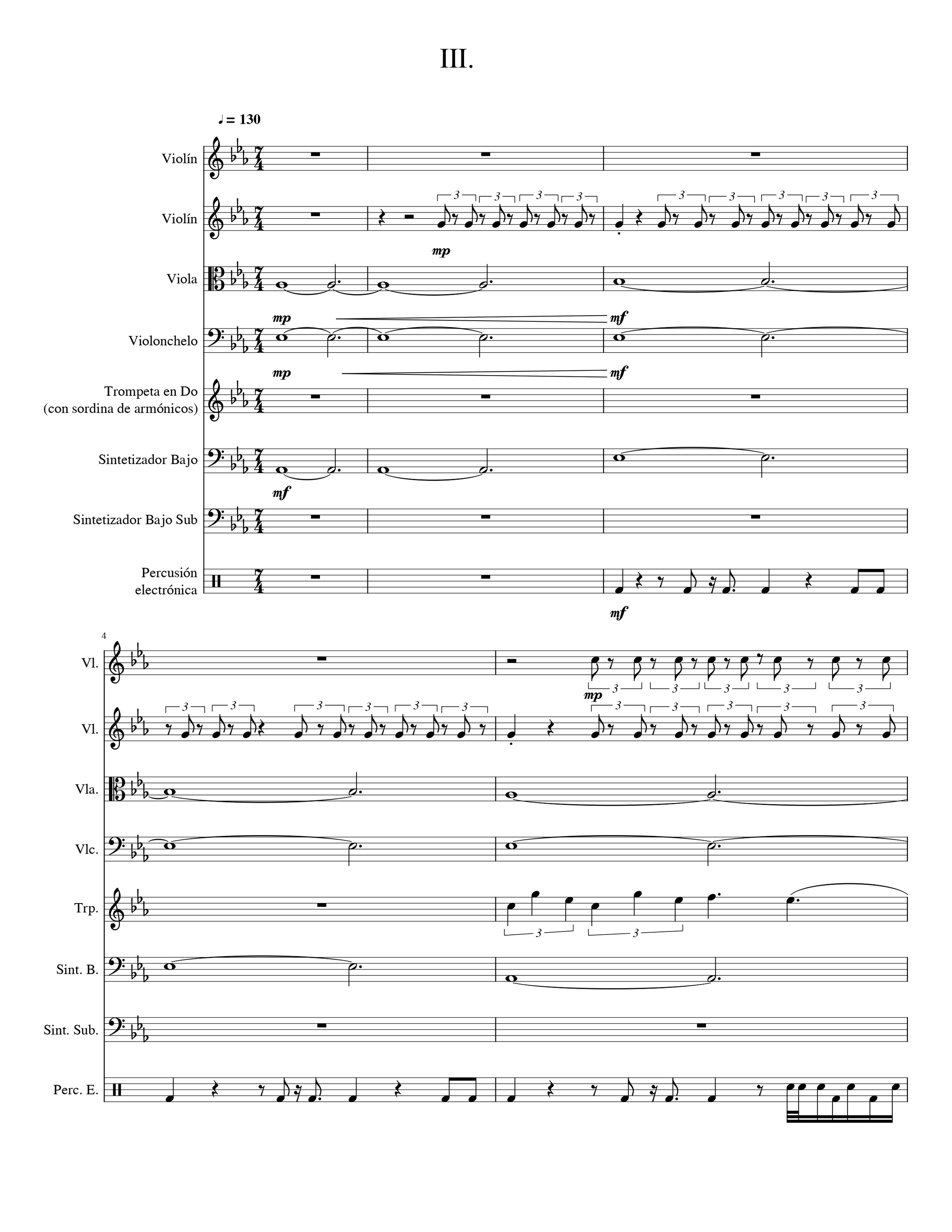 En cuanto a la percusión electrónica, se extiende una invitación abierta a las personas intérpretes para participar de manera activa en el diseño de las sonoridades. Para la grabación mencionada, se utilizaron los timbres del Roland 808. En el caso específico del tercer movimiento, dada la naturaleza repetitiva de la sección percusiva, se sugiere la programación de bucles que contengan las diversas variaciones para que puedan ser reproducidos en la secuencia adecuada.