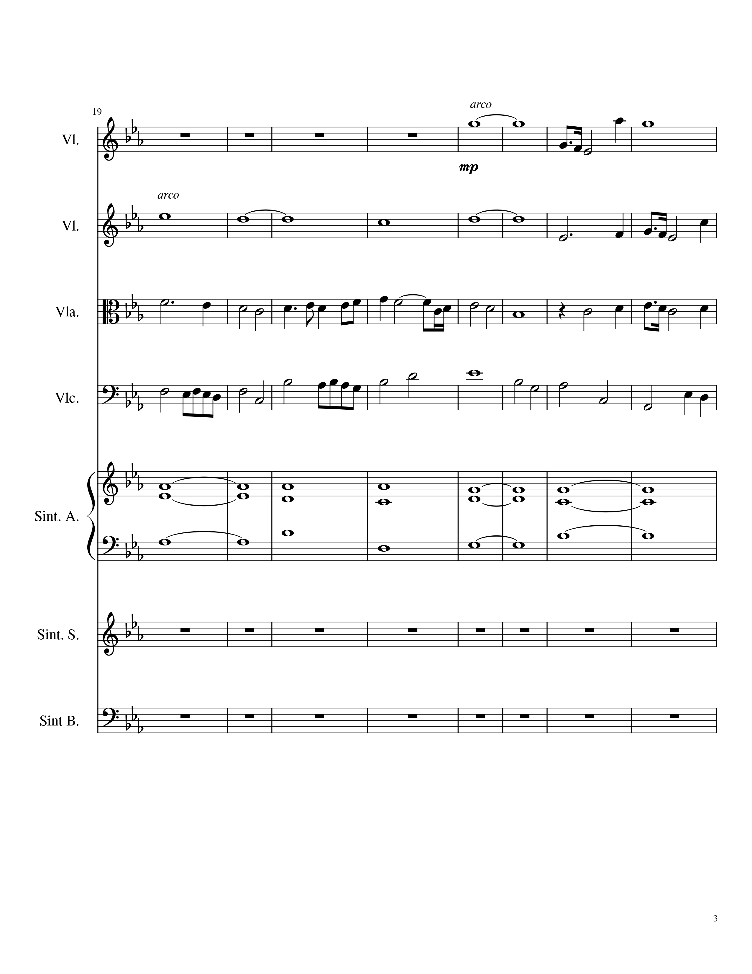 En cuanto al tercer movimiento, cabe destacar la participación especial del solista, quien ejecutará la trompeta con sordina de armónicos. Para realzar su singularidad y protagonismo, se recomienda que el solista se ubique en el centro del semicírculo mencionado anteriormente. Esta disposición permitirá que su sonido envuelva al resto de los músicos, creando un diálogo y potenciando la expresión emocional de la composición.