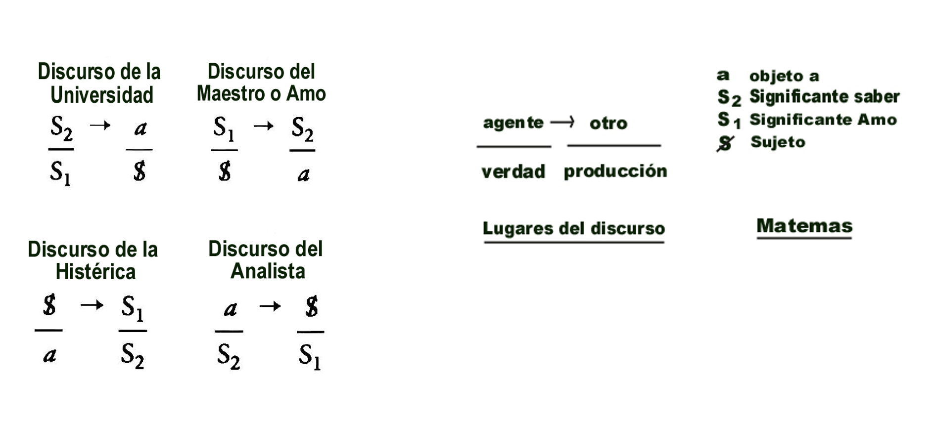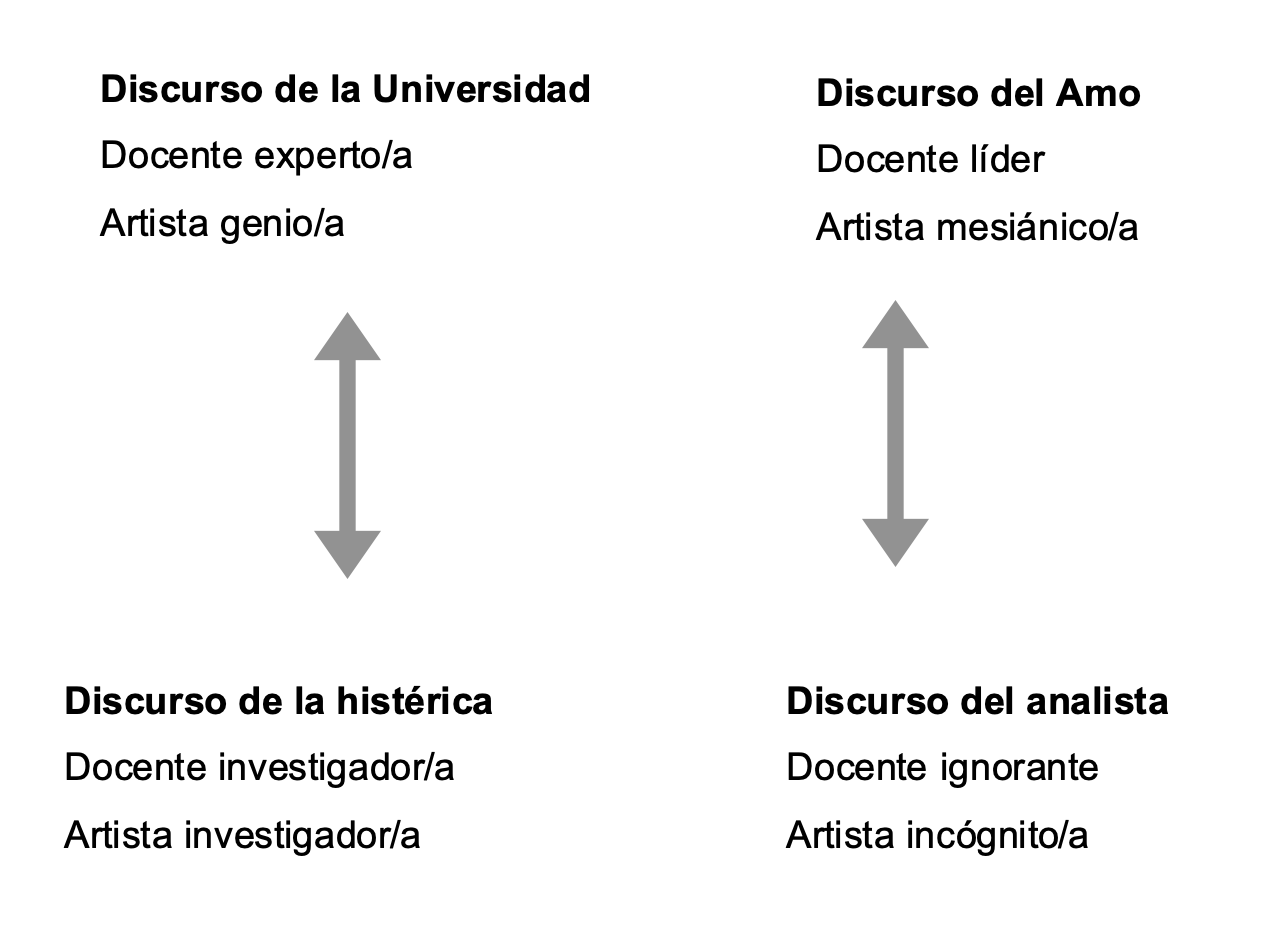 Los diferentes posicionamientos que tanto docentes como artistas pueden asumir supondrían en sí mismos un tipo de discurso, un modo de enunciación que condiciona el vínculo entre las personas. Por tanto, es posible desplazar los roles de “experto” e “ignorante”, que hemos introducido a través de Rancière, a las categorías que el psicoanalista Jacques Lacan (2008) teoriza en el Seminario XVII. El reverso del psicoanálisis a propósito de los cuatro discursos.
