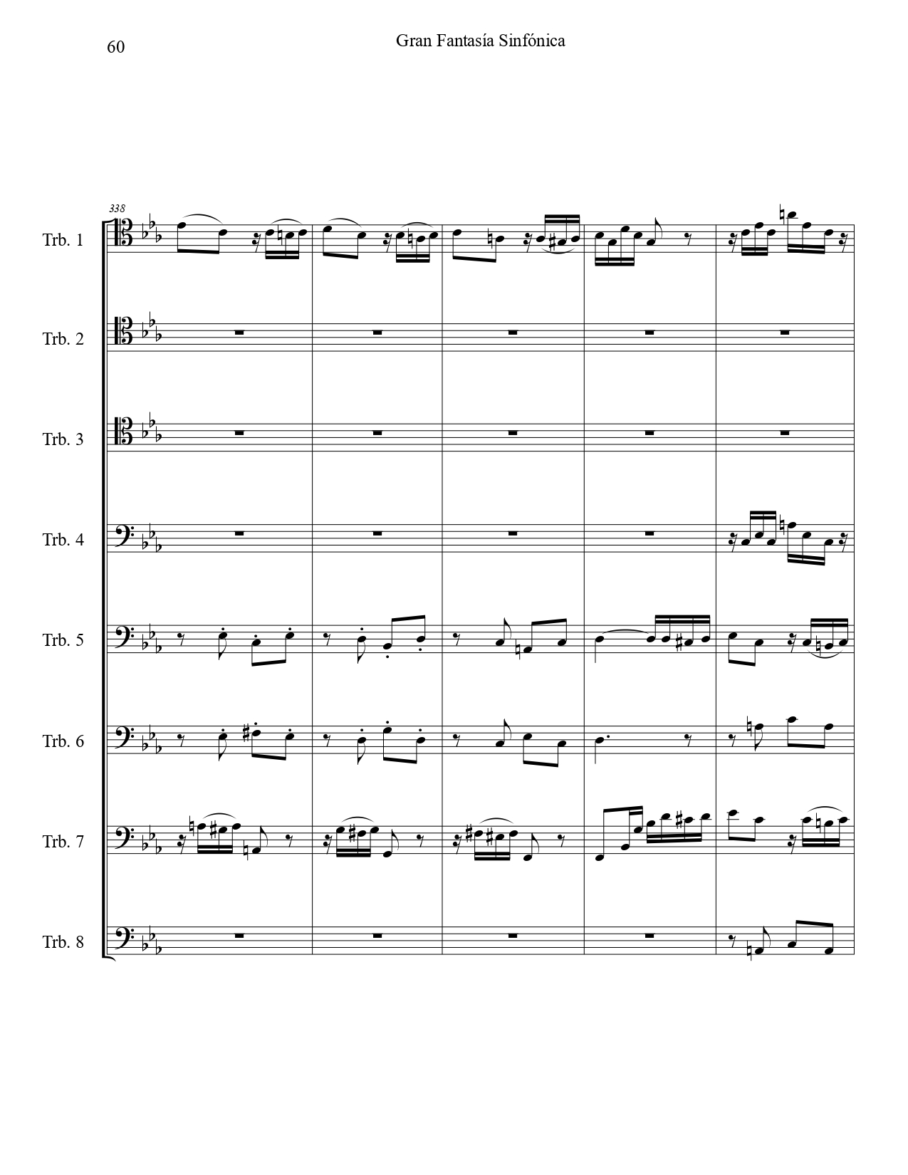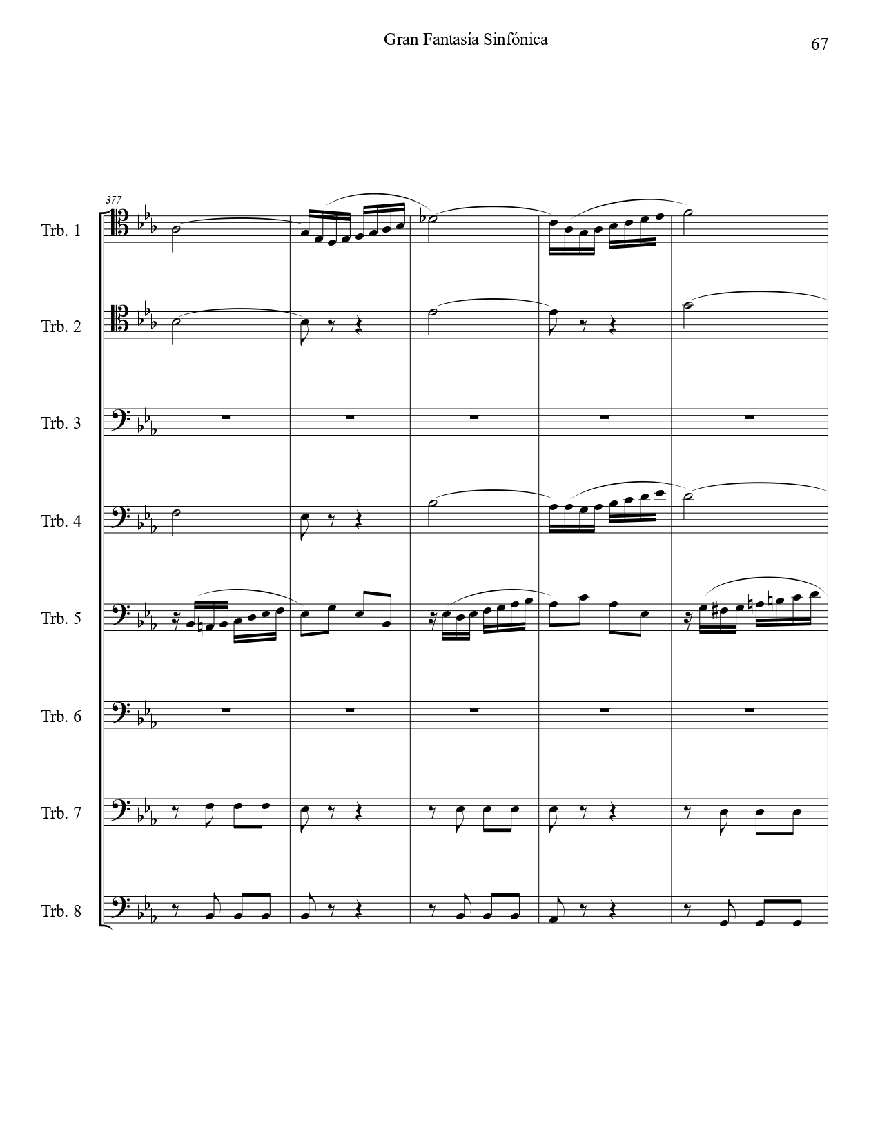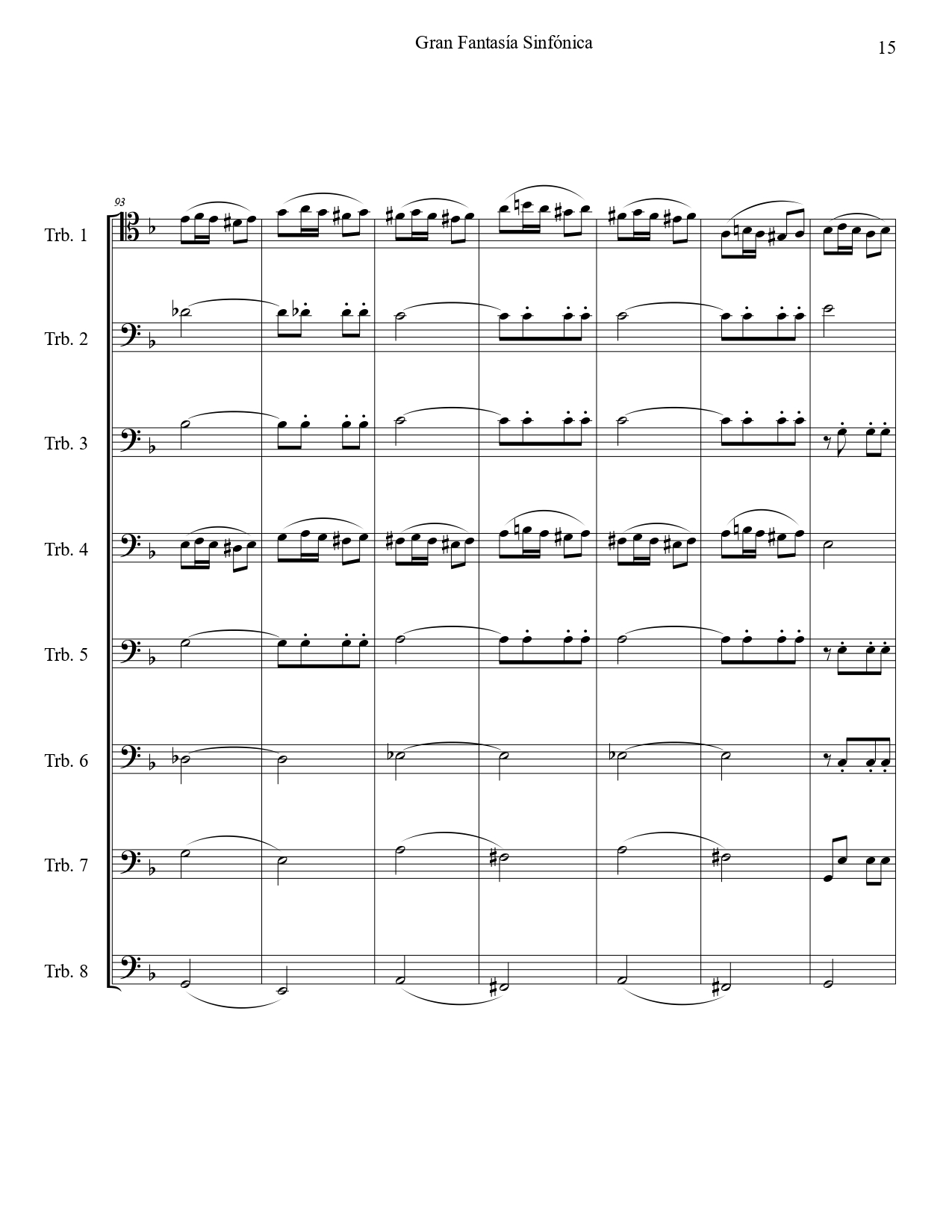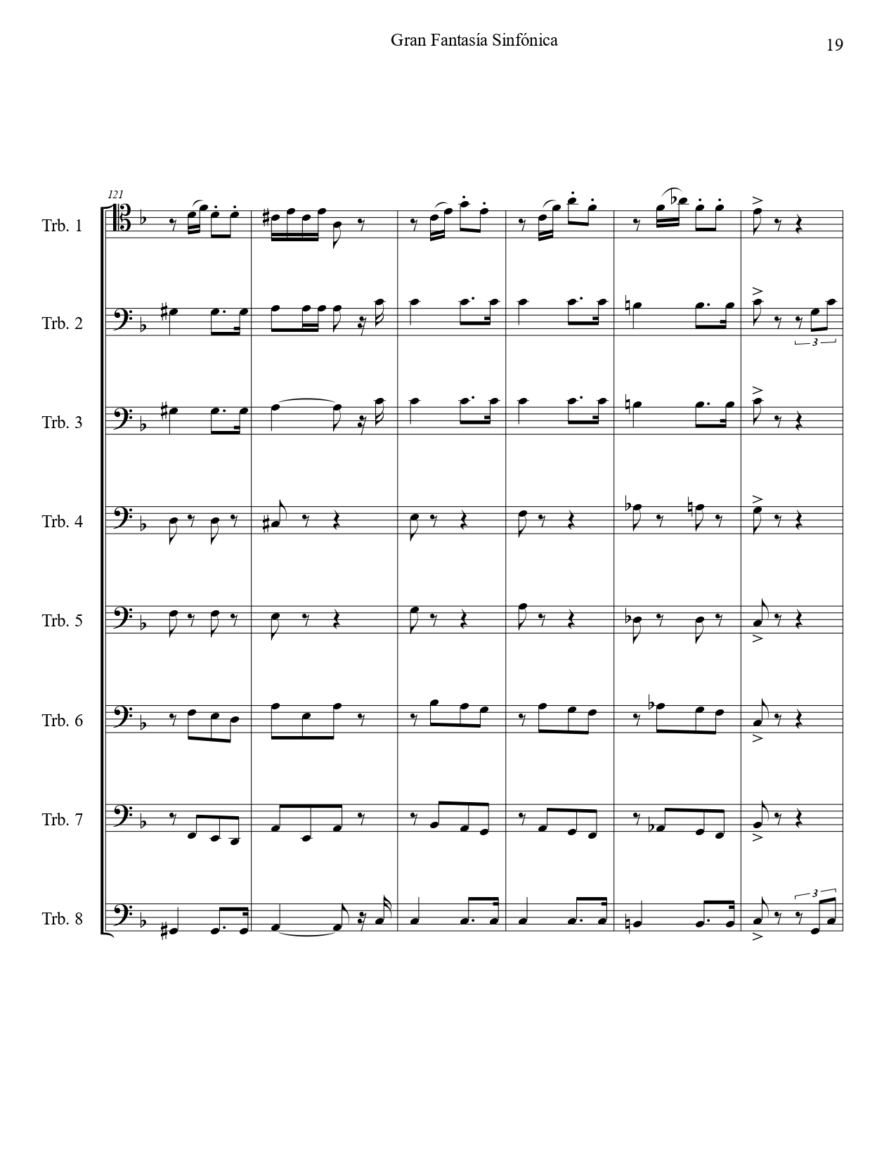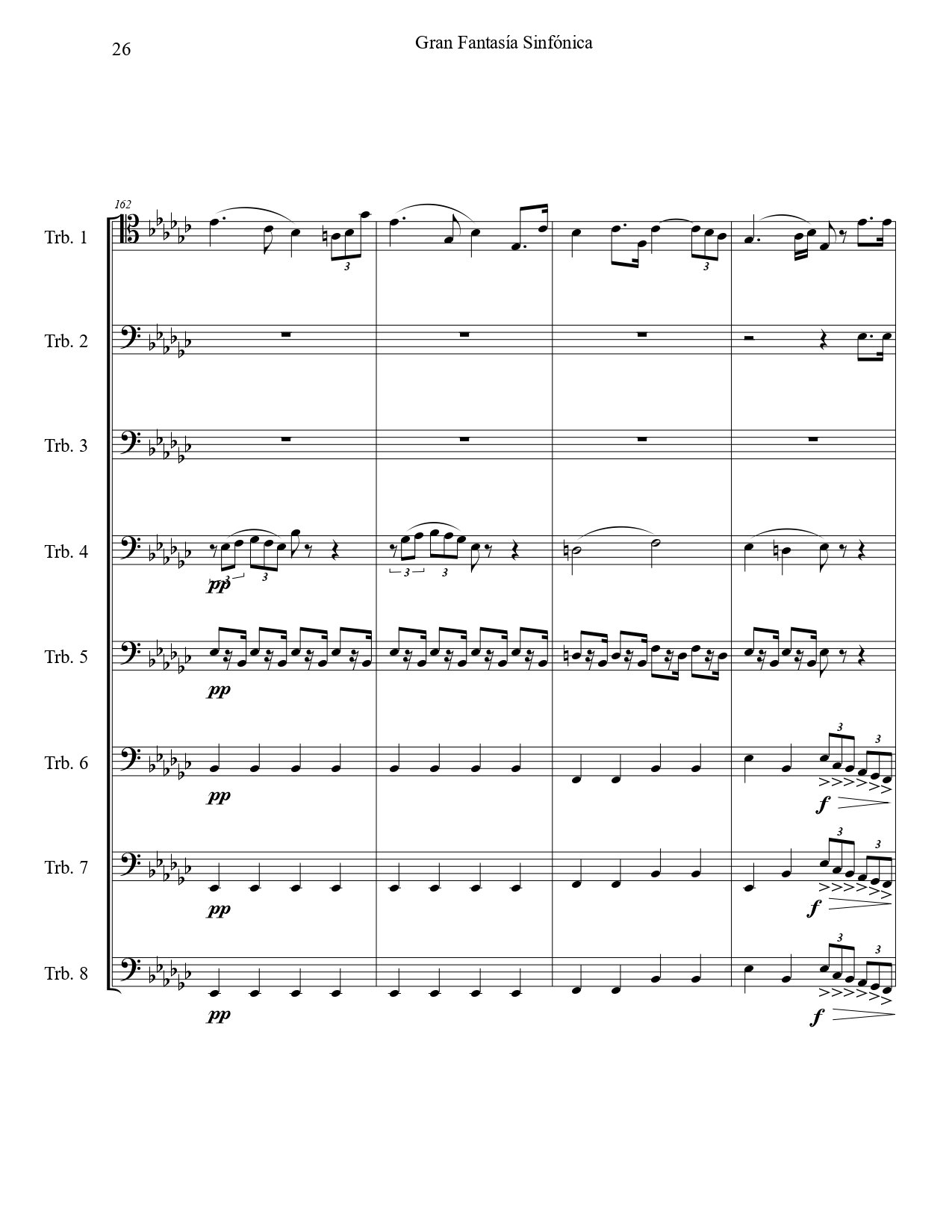 Para realizar este arreglo, se ha tomado como base el manuscrito original para piano del compositor. La obra ha sido arreglada para octeto de trombones; no obstante, por cuestión de sonoridad, se recomienda el uso de seis trombones tenores y dos trombones bajos (en algunos pasajes de la primera voz se podría utilizar el trombón alto). A su vez, se arregla un tono abajo de la tonalidad original y, por aspectos técnicos, en ocasiones, se bajan octavas y se simplifican algunos ritmos. La Gran Fantasía Sinfónica presenta un nivel alto de dificultad, especialmente en las tres primeras voces.