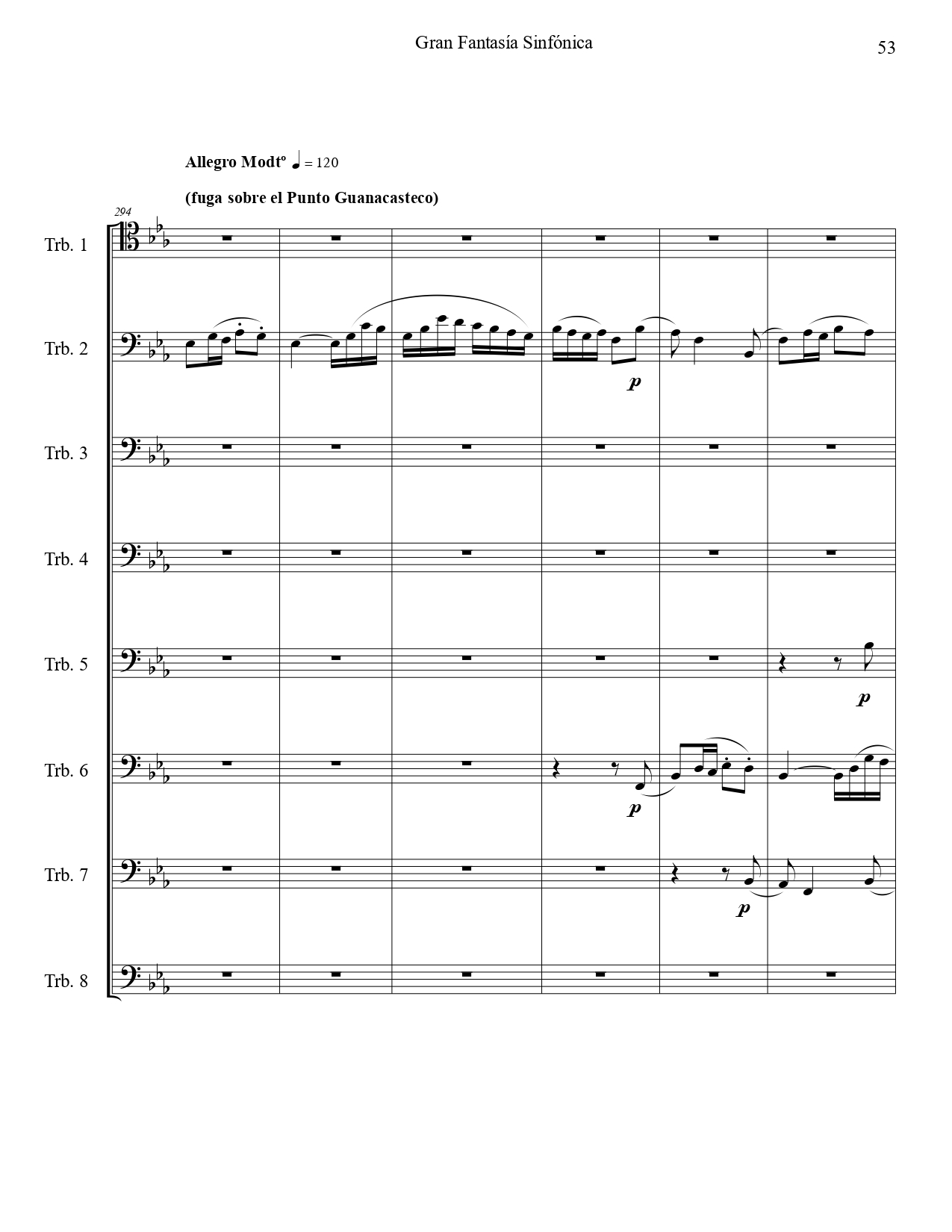 En el compás 287, el compositor regresa a las obras con que inició este trabajo: Punto guanacasteco y el Himno Nacional de Costa Rica; pero en esta ocasión los trabaja de una manera mucho más extensa, y en forma de fuga, con el segundo trombón presentando el tema de la fuga por primera vez. Es en esta última parte de la obra donde Fonseca muestra su dominio armónico y su técnica contrapuntística, merced a la cual consigue una muy buena combinación de los dos temas.