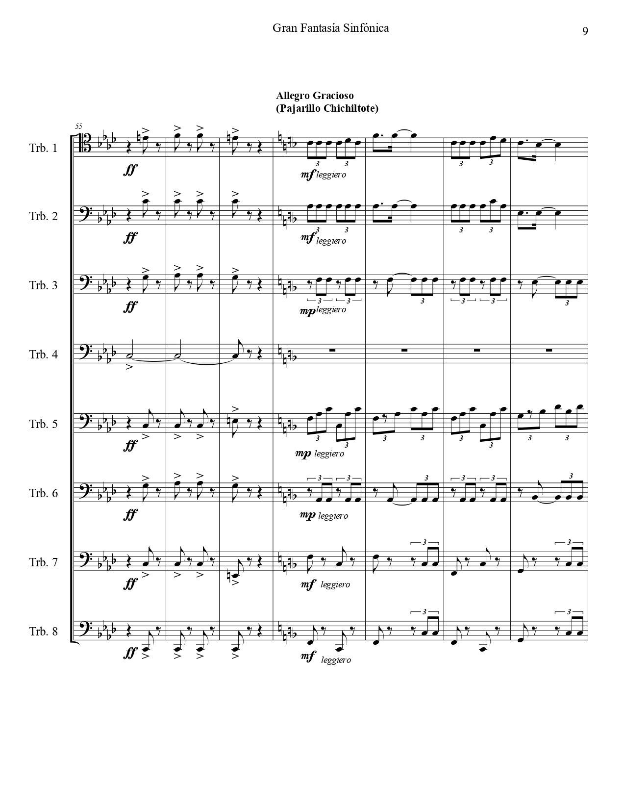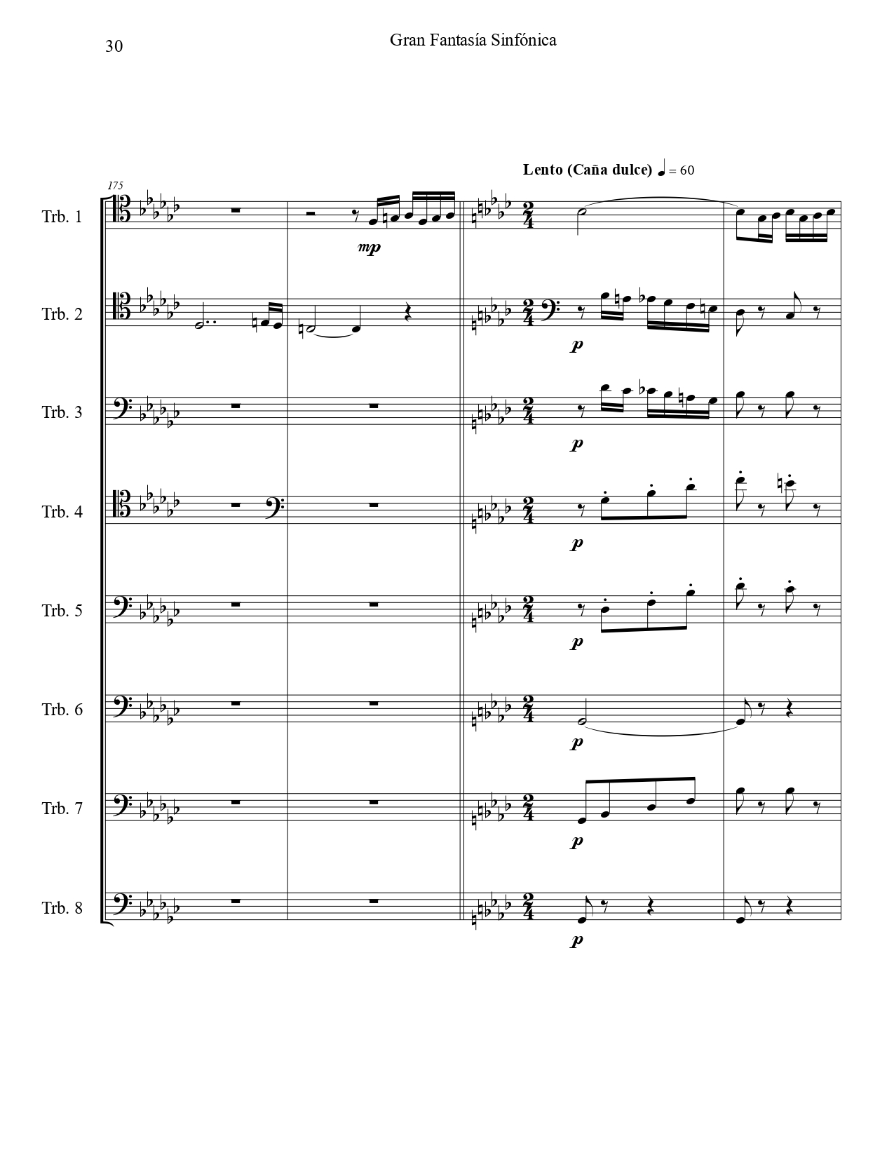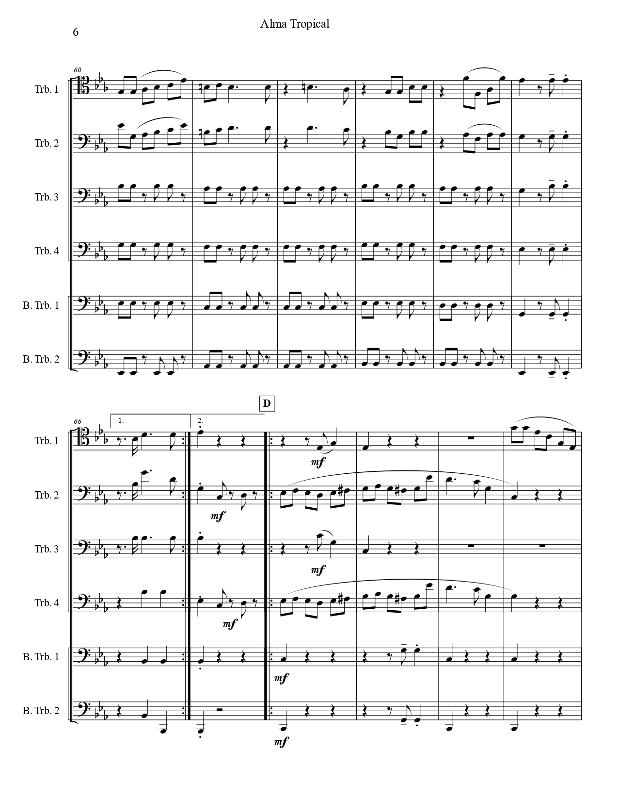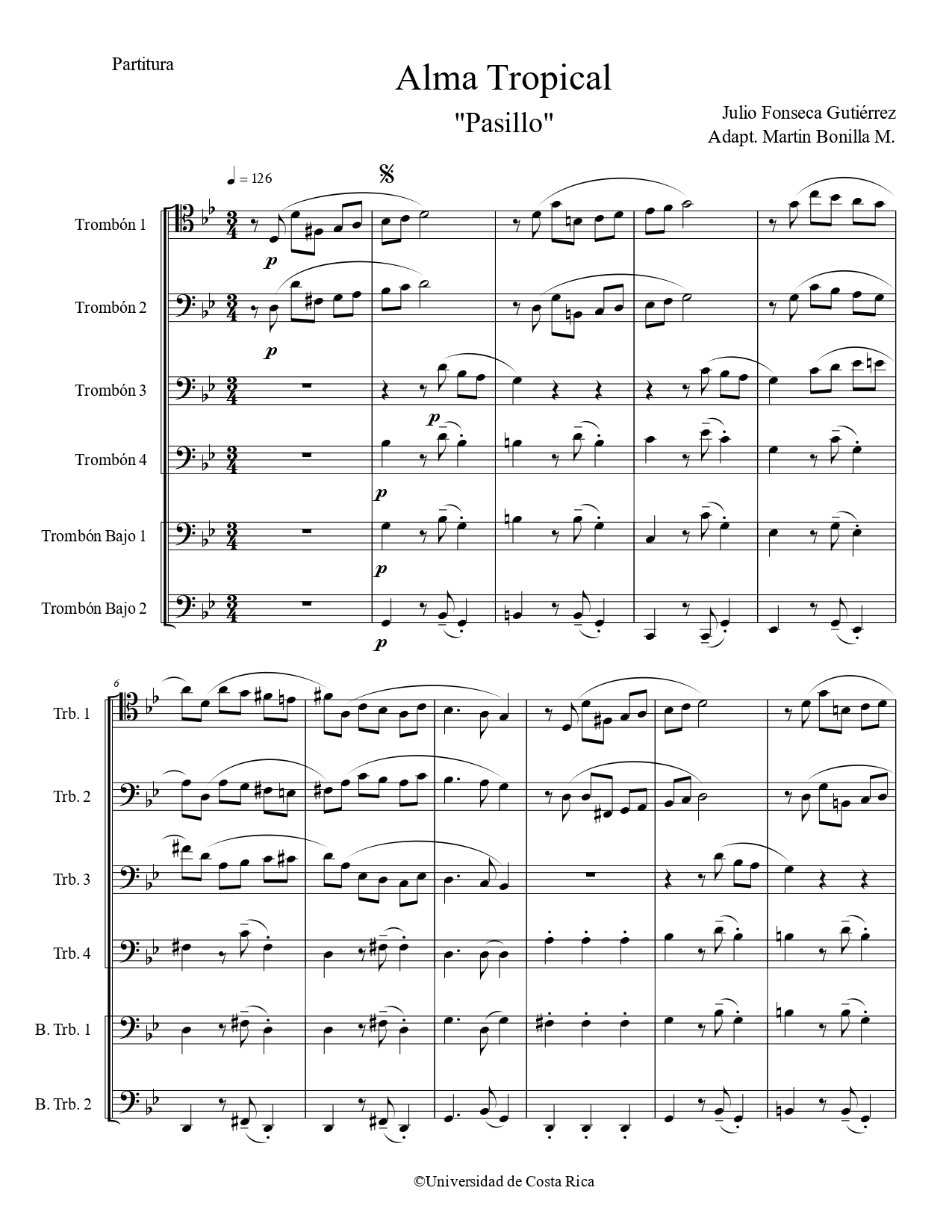 La obra está arreglada en un tono más bajo de la tonalidad original y tiene una métrica de 3/4. Además, presenta cuatro temas expuestos de la manera ABACDCABA. El tema inicial es presentado por los trombones uno, dos y tres, con el acompañamiento de las otras voces. Se representa el ritmo característico del acompañamiento del pasillo. La nota más alta es un do y la toca el primer trombón. El segundo trombón toca una octava baja para facilitar la ejecución y las melodías se reparten en las seis voces. Cabe destacar que se anotó la dinámica escrita por el compositor. Por su parte, las indicaciones para los saltos en las partituras originales son bastante confusas, por lo que aquí se sugiere una manera de interpretar la obra.