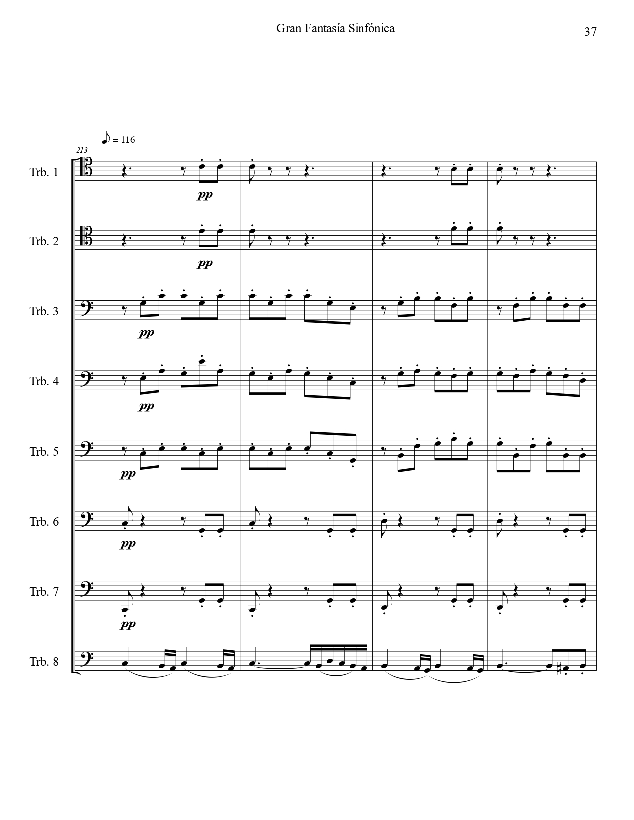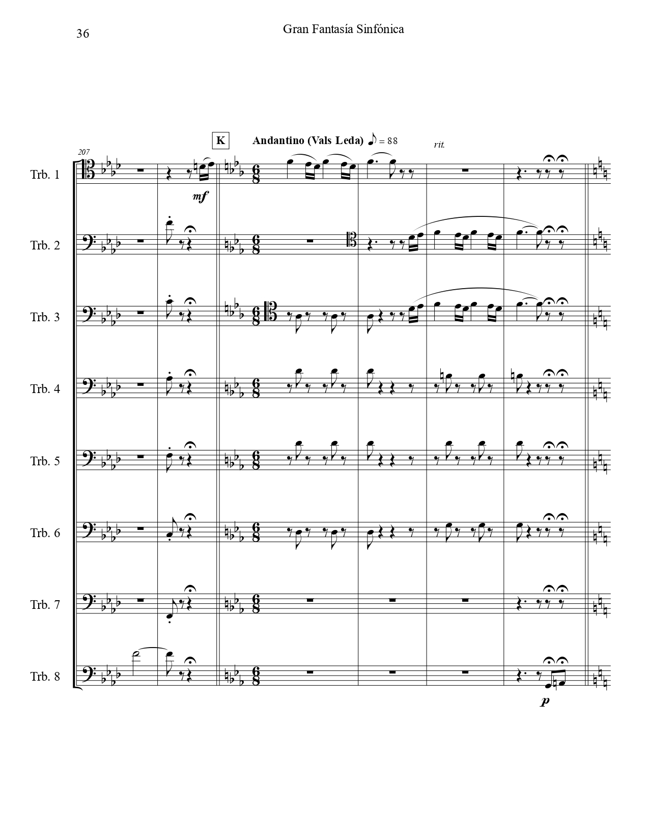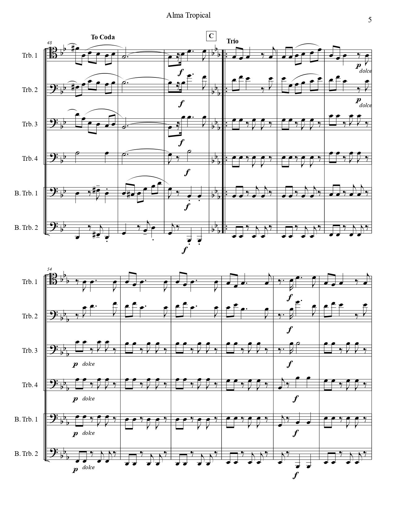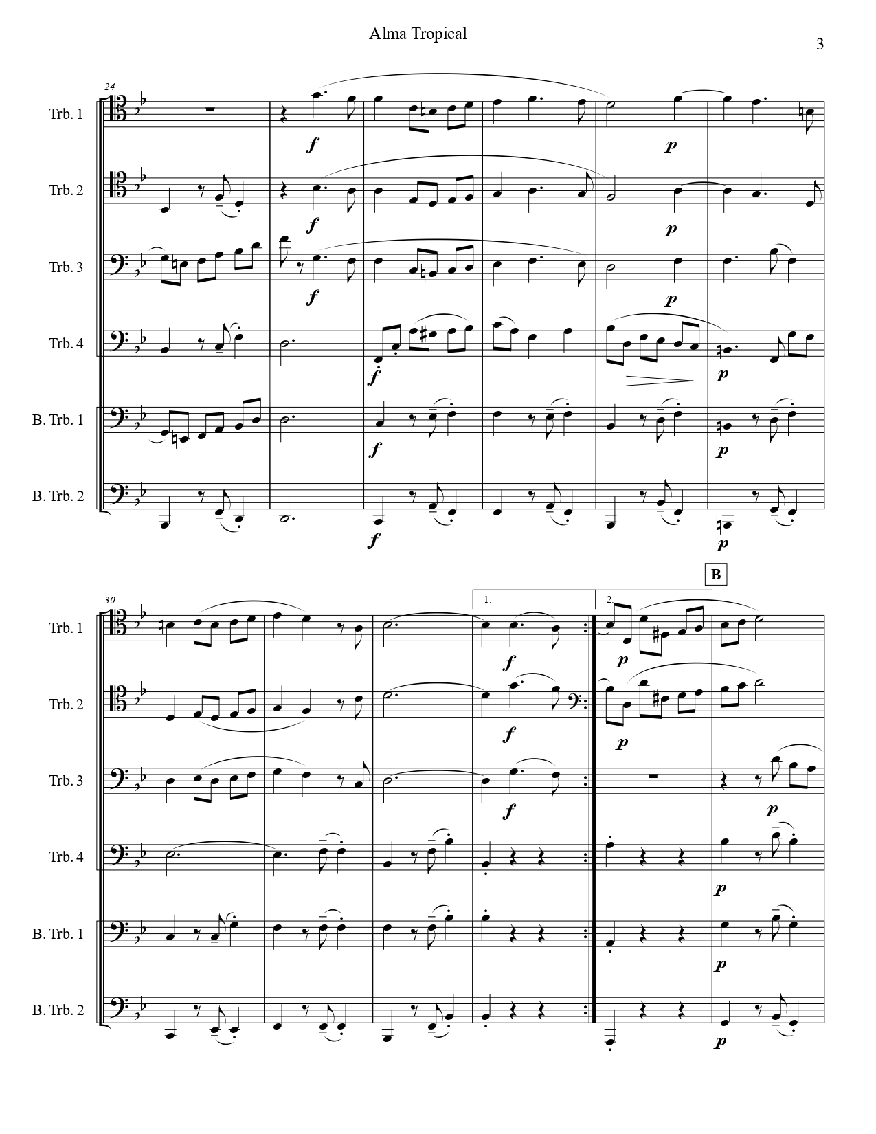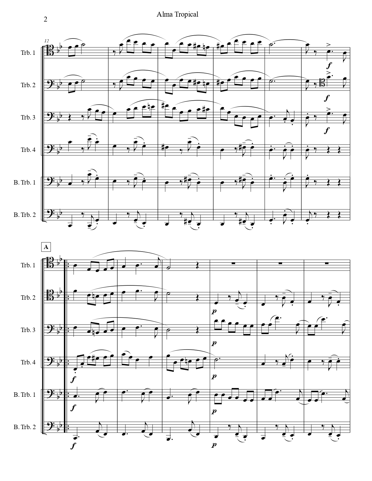 La obra está arreglada en un tono más bajo de la tonalidad original y tiene una métrica de 3/4. Además, presenta cuatro temas expuestos de la manera ABACDCABA. El tema inicial es presentado por los trombones uno, dos y tres, con el acompañamiento de las otras voces. Se representa el ritmo característico del acompañamiento del pasillo. La nota más alta es un do y la toca el primer trombón. El segundo trombón toca una octava baja para facilitar la ejecución y las melodías se reparten en las seis voces. Cabe destacar que se anotó la dinámica escrita por el compositor. Por su parte, las indicaciones para los saltos en las partituras originales son bastante confusas, por lo que aquí se sugiere una manera de interpretar la obra.