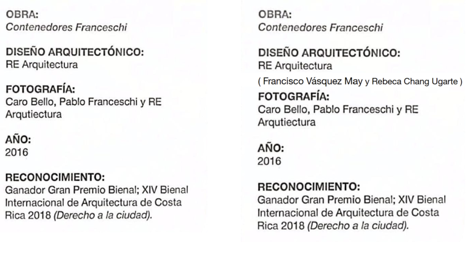 A la hora de diseñar la exposición, se pudo haber visibilizado a las mujeres arquitectas que se encuentran detrás de los colectivos. Por ejemplo, detrás de Salagnac Architects, están Evangelina Quesada (Ciudad Quesada, Costa Rica, 28 de mayo de 1978) y Lucca Spendlingwimmer (Francia, 1 de marzo de 1976); detrás de RE Arquitectura, están Francisco Vásquez May (San José, Costa Rica, 6 de marzo de 1981) y Rebeca Chang Ugarte (San José, Costa Rica, 6 de agosto de 1985); detrás de Studio Saxe, están Benjamín García Saxe (San José, Costa Rica, 27 de agosto de 1980) y Erika Escalante; y detrás de Luz de Piedra, están Luz Letelier Bellalta (Chile, 19 abril de 1974) y Pietro Stagno Ugarte (Santiago, Chile, 28 de septiembre de 1972). Si bien un colectivo busca ser una agrupación de individuos unidos por lazos profesionales o laborales, es decir, no se resalta a los individuos sino al grupo, el simple acto de mostrar sus nombres (Figura 5) contribuye al reconocimiento y visibilización del trabajo de estas cuatro mujeres cuyos aportes han quedado ocultos detrás del colectivo, por lo que, para el espectador o espectadora, son invisibilizadas y borradas.