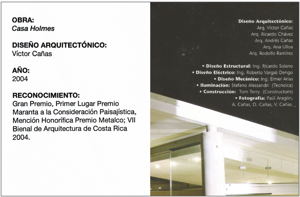 Otro ejemplo relevante relacionado con la invisibilización de las mujeres dentro de los colectivos o equipos de trabajo en esta exhibición podría ser el caso del proyecto Casa Holmes (Playas del Coco, Guanacaste, Costa Rica, 2004), galardonado con el Gran Premio Bienal en el 2004. En la ficha técnica del proyecto (Figura 6), el MADC le otorga la autoría al arquitecto Víctor Cañas; sin embargo, realizando una revisión de la revista Habitar 47 (Figura 6), se puede destacar que el diseño arquitectónico del proyecto fue realizado por los arquitectos Víctor Cañas, Ricardo Chávez, Andrés Cañas, Rodolfo Ramírez y la arquitecta Ana Ulloa (Colegio de Arquitectos de Costa Rica, 2004b, p. 17). Una vez más, este tipo de omisiones provoca formas de invisibilización de las mujeres y, además, alimenta el mito del arquitecto como estrella y figura que trabaja en solitario, ocultando al equipo de trabajo detrás del proyecto y sus aportes.