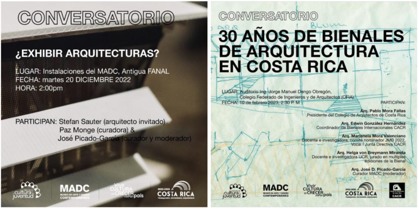 Entre las fuentes consultadas se tomó en consideración: la exhibición, su texto curatorial, la información relativa a esta en la página web y redes sociales, el panfleto promocional y los dos conversatorios realizados por el MADC. En primer lugar, se recopiló y registró información acerca de la exposición. Se realizaron múltiples visitas al museo con el fin de registrar, por medio de fotografías, las obras expuestas, así como sus fichas técnicas. Adicionalmente, se asistió a dos conversatorios organizados por el MADC relacionados con la exposición: el primero fue realizado el 22 de diciembre del 2022 en el museo, y el segundo, el 10 de febrero del 2023 en el Auditorio Ing. Jorge Manuel Dengo Obregón en el Colegio Federado de Ingenieros y Arquitectos de Costa Rica (Figura 2).