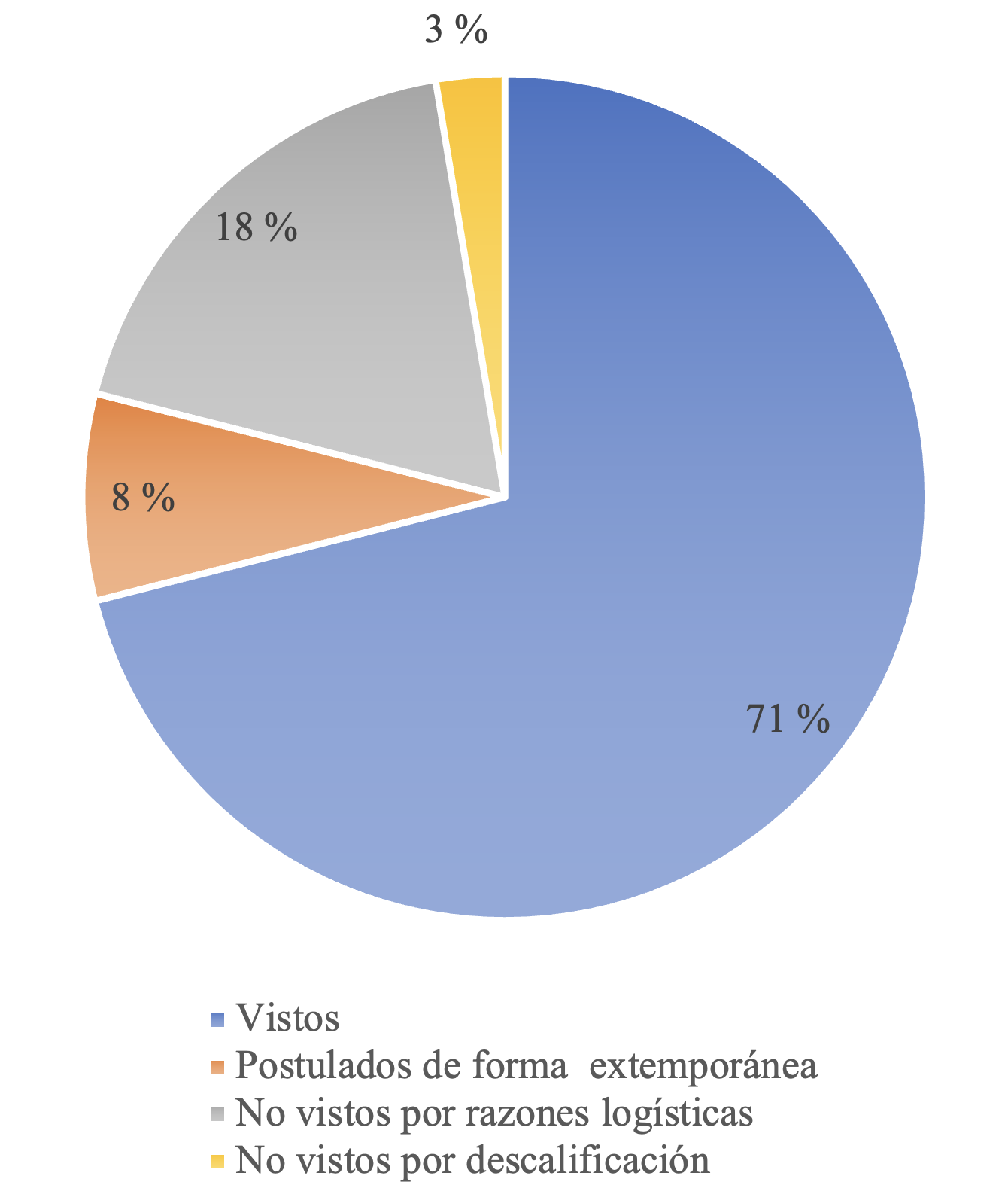 El corpus consiste en los espectáculos que fueron postulados al Premio Nacional Ricardo Fernández Guardia 2021, en alguna de sus tres categorías, y que fueron vistos por mi persona. De un total de 38 espectáculos postulados, quedan excluidos aquellos que fueron postulados de forma extemporánea (después de las fechas de la temporada del espectáculo) por razones logísticas (choque con otras postulaciones o postulaciones realizadas el mismo día de una única función, imposibilidad para contactar o desplazarse al lugar del evento, u otras), o descalificación (por formato o haber sido premiado anteriormente por el mismo espectáculo), por lo que no fueron vistos (véase la Figura 1).
