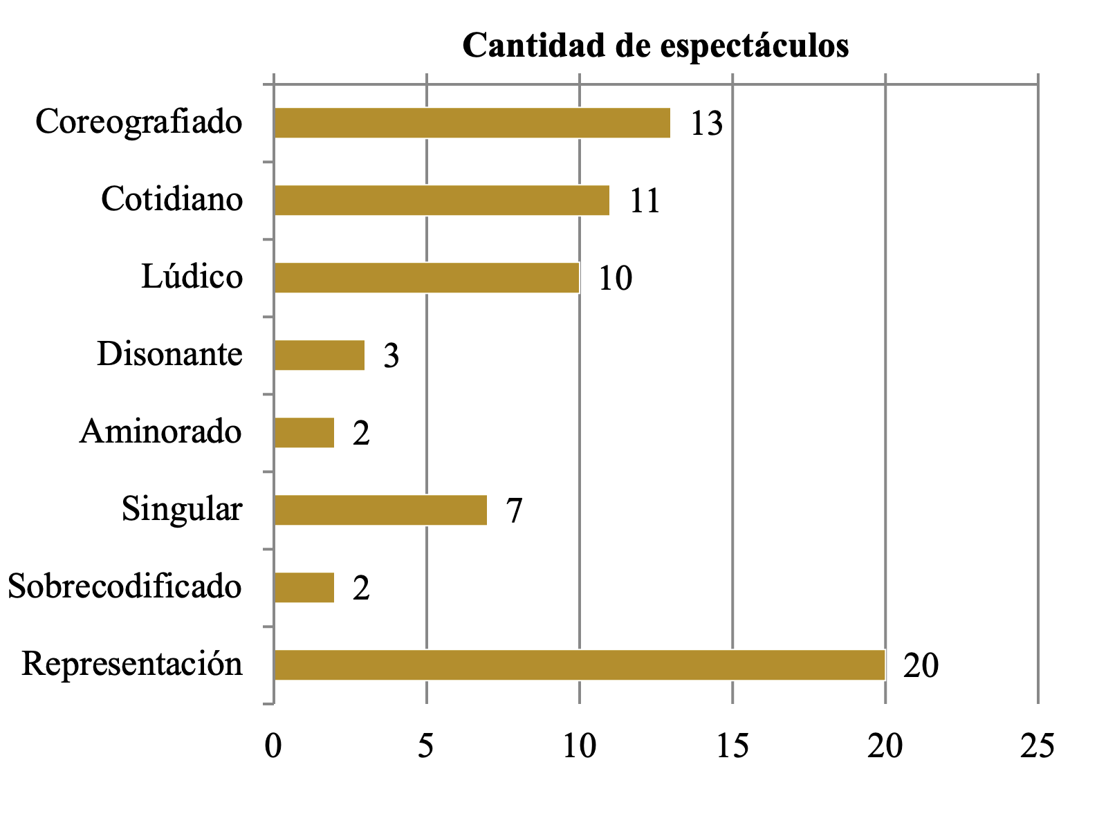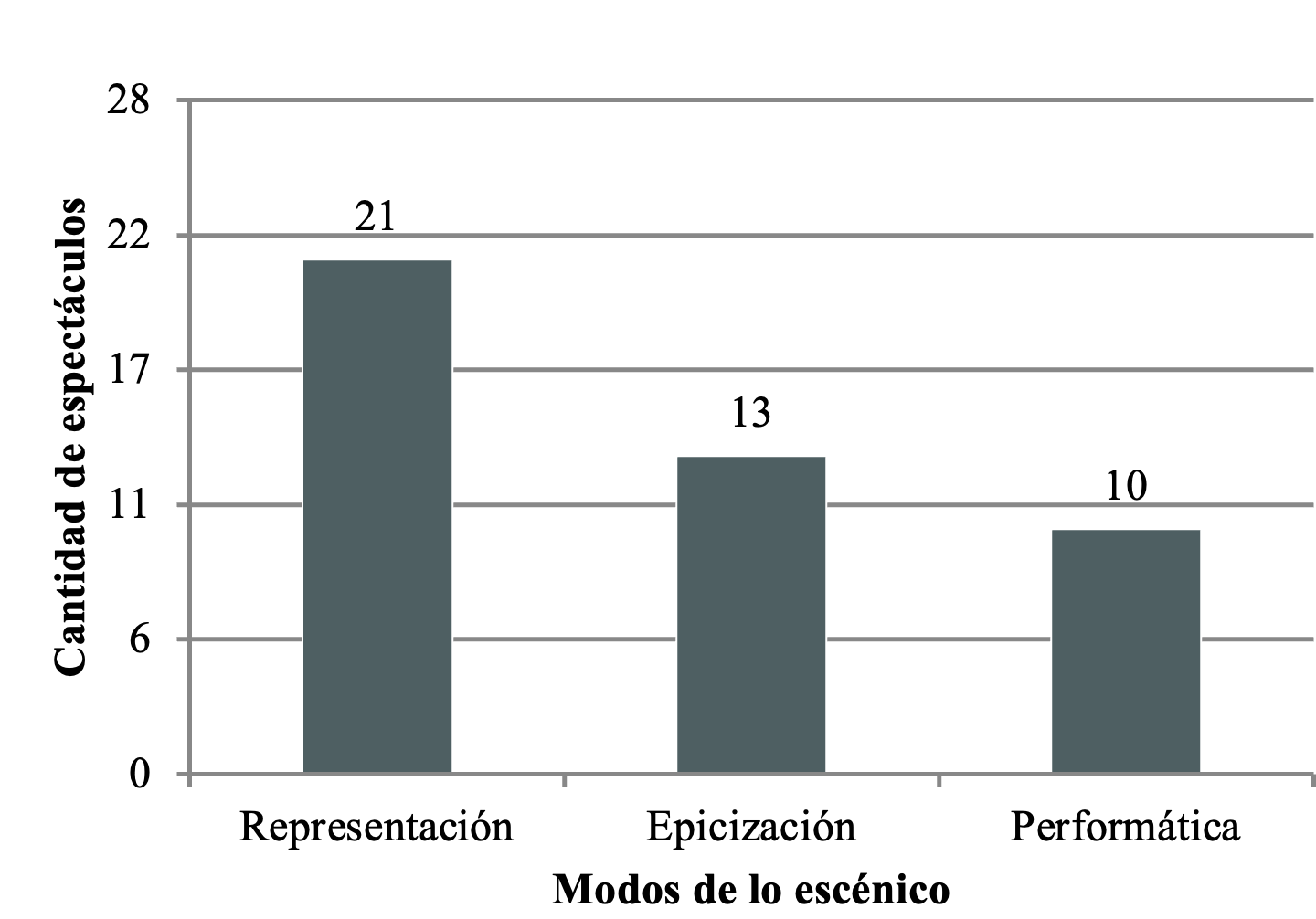 Como se planteó más arriba, el estudio de los aspectos tipológicos consiste en observar cuáles modos de lo teatral se presentan como parte del acontecimiento: representación de situaciones dramáticas, epicización o acciones performáticas. En la Figura 2, se pueden ver la cantidad de espectáculos que presentan estos rasgos.