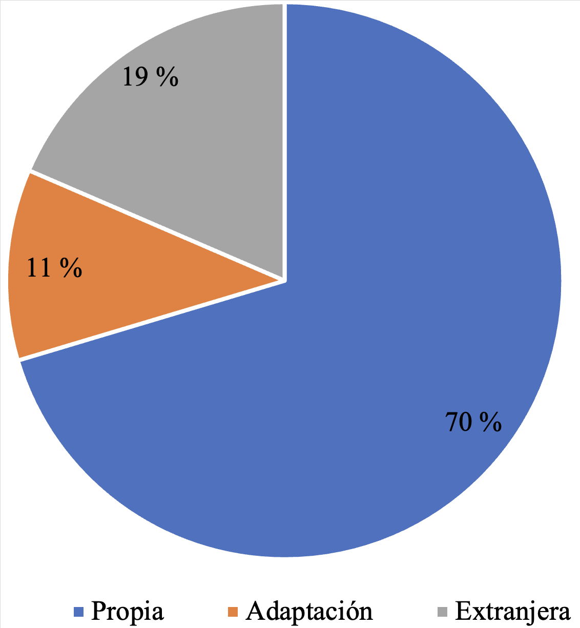 Un aspecto sobresaliente en el corpus es la preferencia por la puesta en escena de obras y dramaturgias3 nacionales por sobre la puesta en escena de textos extranjeros. En la Figura 4, se pueden observar los porcentajes tanto para el trabajo dramatúrgico nacional, 70 %, así como aquellas escenificaciones que parten de textos extranjeros, los cuales representan el 19 %4. Por aparte, se categorizan las adaptaciones, de las cuales dos parten de textos narrativos (Mujercitas y El Quijote, según Sancho Panza) y una de un texto dramático (Deseo 1, adaptación de Un tranvía llamado deseo de Tennessee Williams).