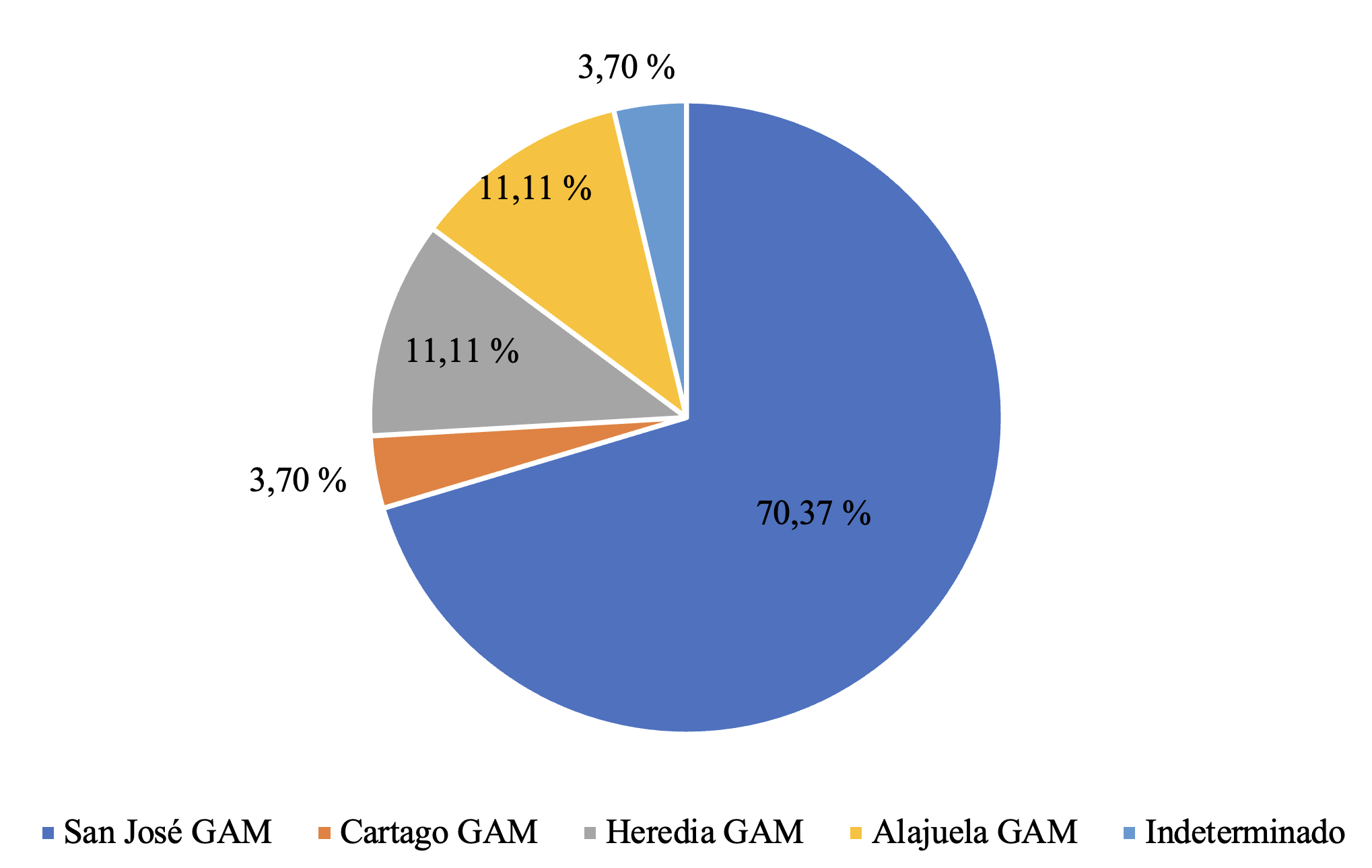 La totalidad de los espectáculos que conforman el corpus se ubican en teatros ubicados en la GAM, que reúne la mayor parte de la actividad teatral del país. Solamente dos espectáculos postulados (que no forman parte del corpus) se ubicaban en comunidades alejadas de la GAM. Se puede visualizar la dimensión de la territorialidad de las salas de teatro en la Figura 5.