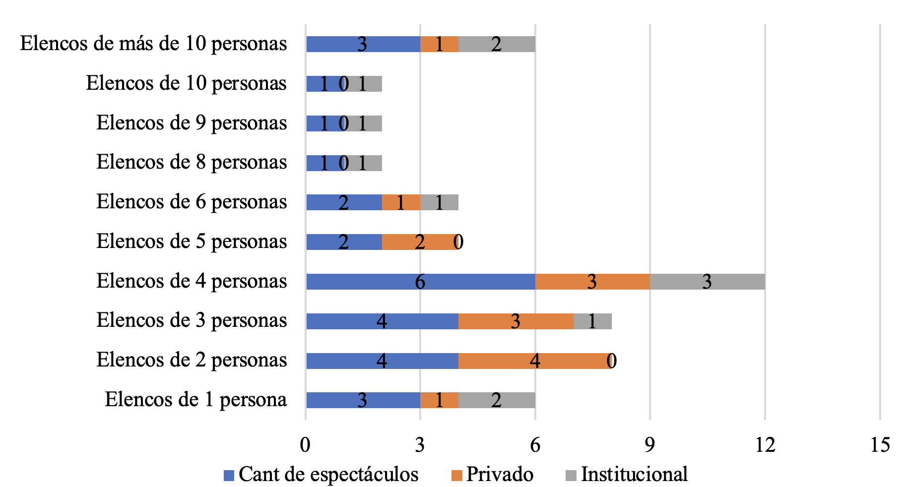 Por otra parte, es posible observar que los montajes con elenco de 8, 9 o 10 personas tienen como parte de su financiamiento distintos apoyos institucionales. En las categorías de elencos de 1 a 5 personas se cuantifican el 86.67 % de los espectáculos de financiamiento exclusivamente privado. En cambio, para el mismo grupo de categorías, los espectáculos con subsidios institucionales son del 50 %. Se concluye de esto que las iniciativas ambiciosas en cuanto a recursos y cantidad de personas involucradas en la producción solo es posible si se tiene un enorme respaldo de patrocinio privado o un apoyo decidido del sector institucional.