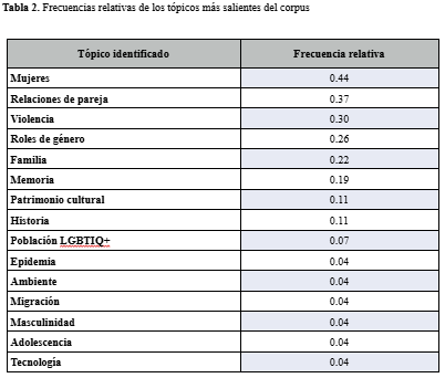A pesar de que las condiciones del contexto promoverían tópicos que se esperaría que fueran destacados, como es el caso de la celebración del Bicentenario de la Independencia o la situación de la pandemia por el COVID-19, son los tópicos relacionados con el género y la situación política y social de las mujeres los que fueron tratados con mayor frecuencia por las personas creadoras de los espectáculos del corpus para el año 2021 (véase la Tabla 2).