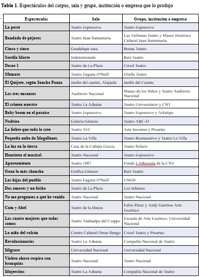Abstract: Introduction: This is a descriptive study of the shows nominated for the 2021 Ricardo Fernández Guardia Theater National Award, documenting part of the theatrical events that occurred in that year. Objective: The aim is to describe the most relevant aspects of the nominated shows as observed by the researcher, based on typological, thematic, and socio-economic criteria. Methods: The shows from the corpus were observed, and notes were taken, which were later systematized in a spreadsheet according to the proposed categories. Results: For the period, the observed production displays a combination of enunciation modes and acting modalities, with women emerging as the dominant theme. At the socio-economic level, there is a limited regionalization and casts determined by access to resources. Conclusions: It is suggested that the results are associated with complex processes of sociocultural change, emphasizing the need to study theater based on increasingly comprehensive corpora.