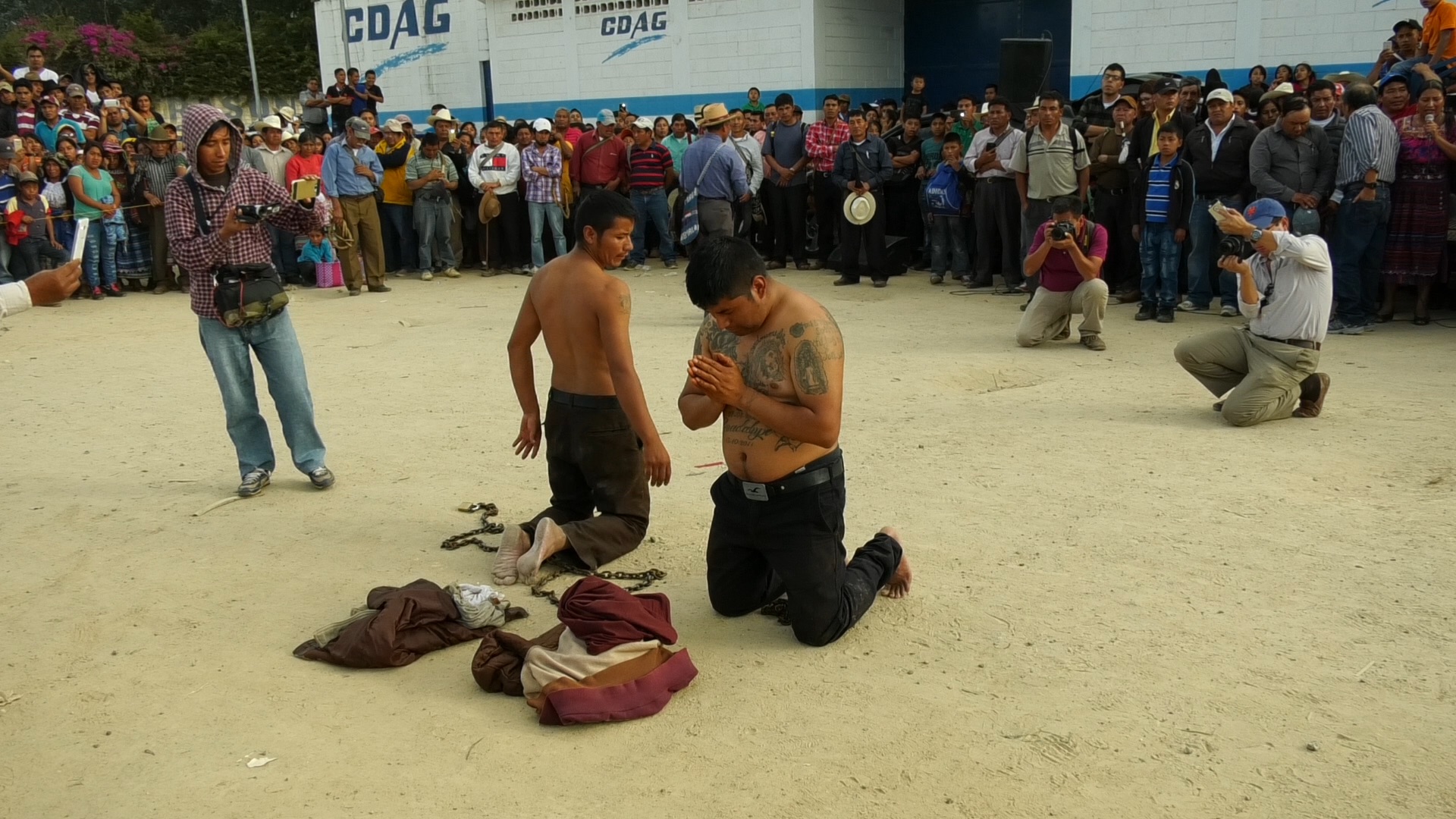 Dado el escaso acceso al sistema de justicia estatal, algunas localidades k’iche’ en el occidente de Guatemala procesan judicialmente y de manera pública por medio de juicios dentro del llamado Derecho maya a personas acusadas de delinquir. Estas prácticas son conocidas localmente como suk’ b’anik (corrección/enderezamiento), las que con frecuencia ofrecen coreografías espectaculares y altamente ritualizadas dirigidas a la población local en primer lugar. En dichos escenarios colectivos, tanto el cuerpo individual como la moral de los acusados son exhibidos y judicializados por las autoridades locales frente a audiencias que reclaman un disciplinamiento corrector (ver Figura 1). Tal visualidad otorga al lenguaje corporal y/o performance de los participantes un papel fundamental en los procedimientos legales mayas. Esto, a su vez, cumple también la función de actuar como metáfora de saneamiento moral y reequilibrio del cuerpo social, al tiempo que se reafirman estructuras de poder local.