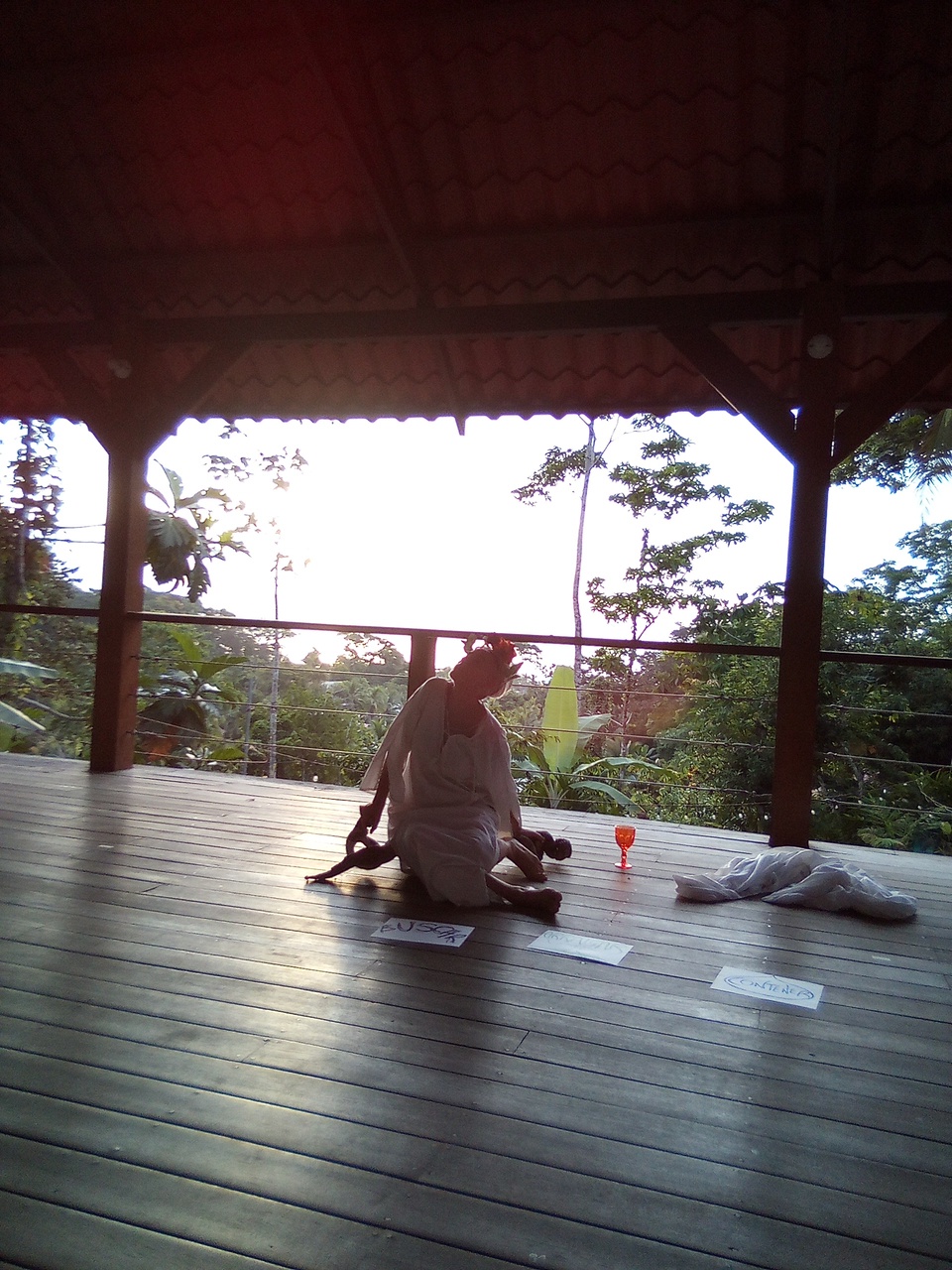 Para la última sesión y clausura del taller, a esa instalación escénica ya presentada se le debía adicionar una acción física y algún componente textual o uso de la palabra para crear la escena del biomonólogo final. Así, tanto la palabra como la acción se repetían indefinidamente (en un loop), a manera de una metáfora vital que movilizaba emociones durante su ejecución porque hablaba de sus propias identidades (quiénes son, qué buscan y qué quieren contar sobre sí mismas).