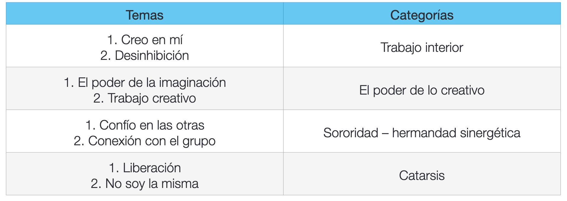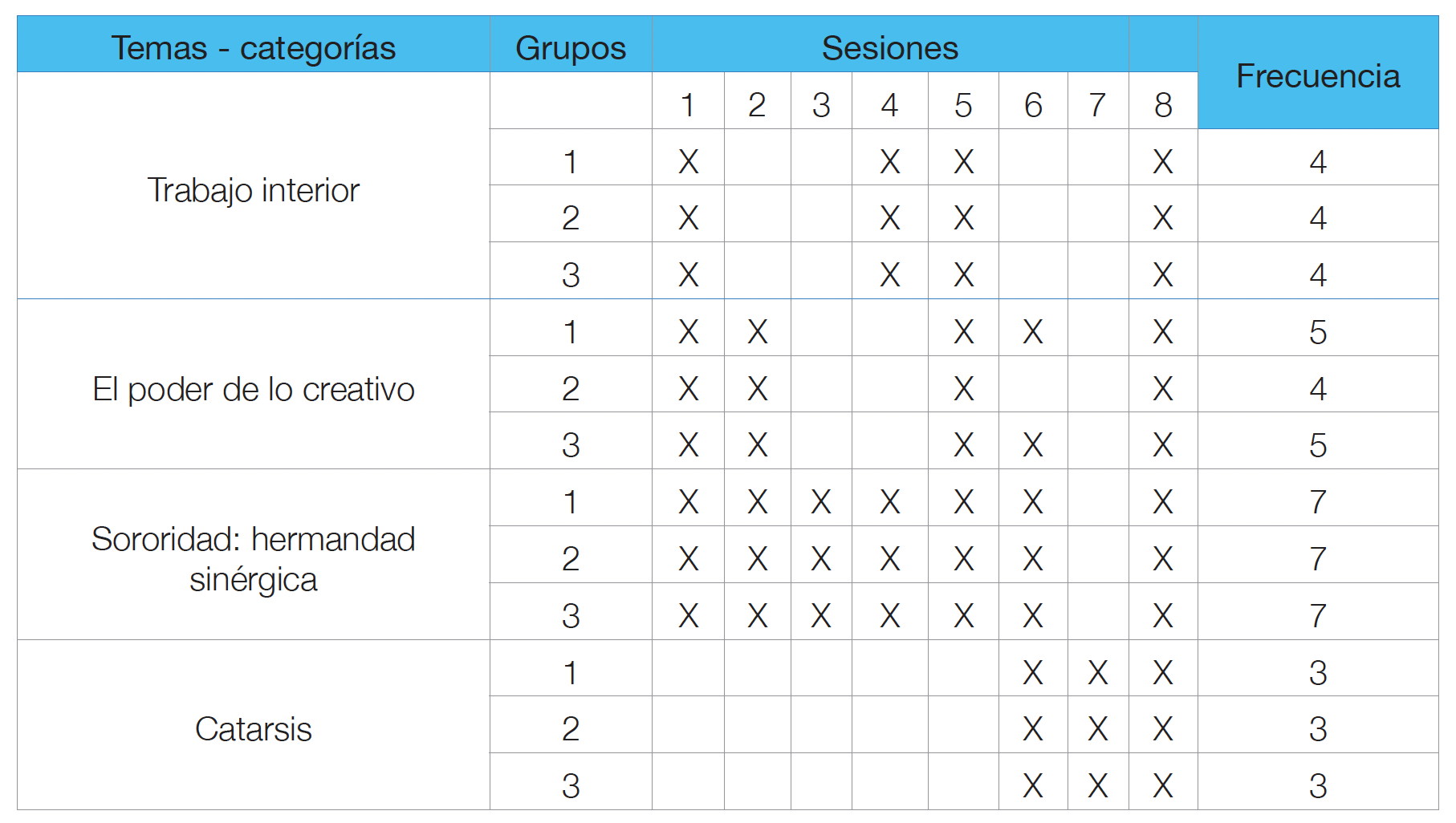 En la tabla anterior, se observa cómo la sororidad fue la única categoría que estuvo presente en cada sesión de todos los talleres, es decir, que se registra en las tres muestras. Además, se observa la aparición de la catarsis únicamente en las últimas tres sesiones, de igual manera en las tres muestras.