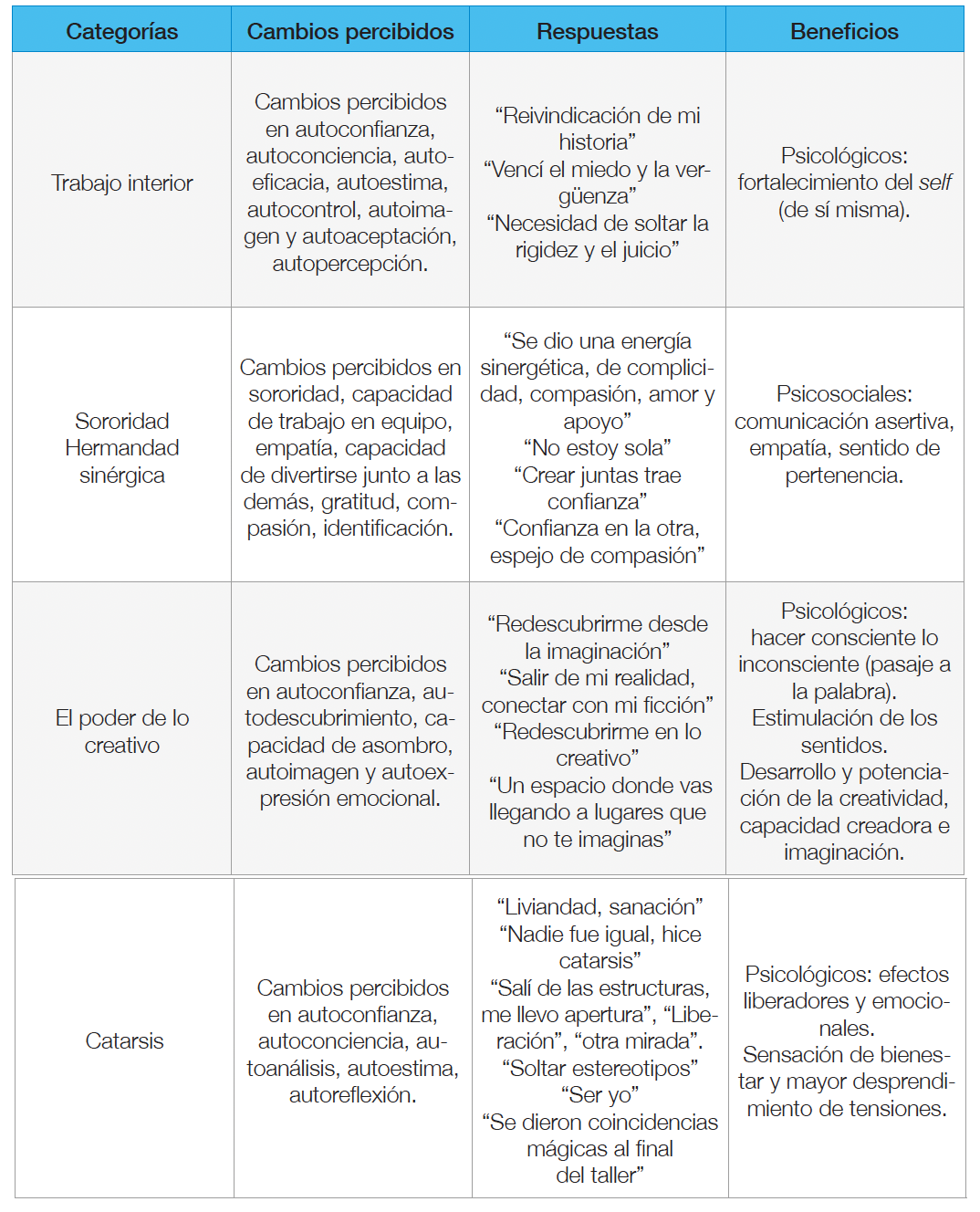 Por otro lado, la Tabla 5 exhibe los beneficios que se deducen de la relación entre las categorías, las respuestas de las participantes y los cambios percibidos. A partir de estos datos, se infieren los beneficios psicológicos que las involucradas experimentaron con la experiencia.