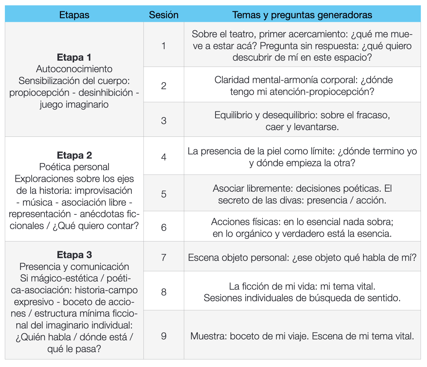 Cada etapa comprendía tanto trabajo corporal realizado en grupo durante las sesiones como trabajo individual. Este último consistía en la preparación de tareas para avanzar progresivamente en la creación del biomonólogo a presentar al final del proceso.