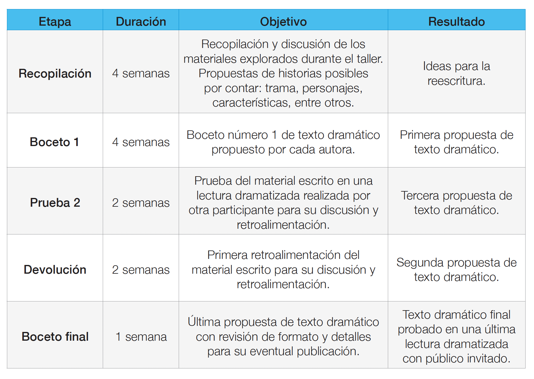 Con el fin de proponer estos cuatro microtextos dramáticos, se realizó una asesoría dramatúrgica organizada en cinco etapas. En la Tabla 2, se observa la estructura de dicha asesoría y se detallan las etapas del proceso de creación, el tiempo para ejecutarlas, sus objetivos y los resultados esperados. Cabe señalar que la entrega de estas tareas y sus correcciones se efectuó vía correo electrónico en las tres primeras etapas, mientras que, en las últimas dos, se dio de forma presencial a través de lecturas dramatizadas dirigidas a un público invitado, con el propósito de obtener retroalimentación.
