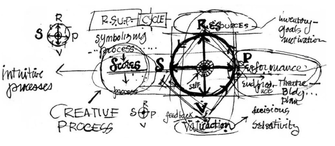 Antes de continuar con la cronología, entender la propuesta metodológica permitirá comprender el hilo de investigación y el desarrollo creativo en Migrāre, por lo que se explica a continuación. Para el desarrollo metodológico macro de este proyecto, se toma como referencia principalmente el ciclo de referencias (RSVP Cycles o Ciclo Repère)6. Esta propuesta inició con el arquitecto paisajista, diseñador y profesor estadounidense Lawrence Halprin (1916-2009), quien publicó en 1969 el libro The RSVP Cycles: Creative Processes in the Human Environment (Halprin, 1969), en el cual expone esta metodología aplicada al ámbito de la arquitectura. Posteriormente, el Ciclo Repère fue adoptado por el actor y director de teatro quebequense Jacques Lessard en el ámbito teatral y funda en 1980 el Teatro Repère. Durante su pasaje en esta agrupación, Robert Lepage, actor y director de teatro, se apropia de la metodología y la lleva a sus trabajos artísticos desde entonces.