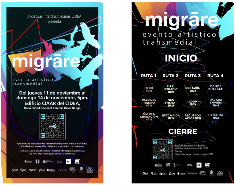 Migrāre3, evento artístico transmedial, se planteó como una propuesta pedagógica y artística, liderada por la Escuela de Arte Escénico (EAE) de la Universidad Nacional de Costa Rica (UNA), la cual fue ganadora del concurso Iniciativas Interdisciplinarias del Centro de Investigación, Docencia y Extensión Artística (CIDEA) 2021 de la UNA. Este contó con la participación de personas estudiantes y académicas de las Escuelas de Arte Escénico, Danza, Música y Arte, y Comunicación Visual, además de proyectos como Teatro UNA, Web CIDEA - Laboratorio Escénico Digital (LED), CTO-Heredia, Teatro en el Campus de la EAE y el programa Investigación, Arte y Transmedia (iAT) del CIDEA.