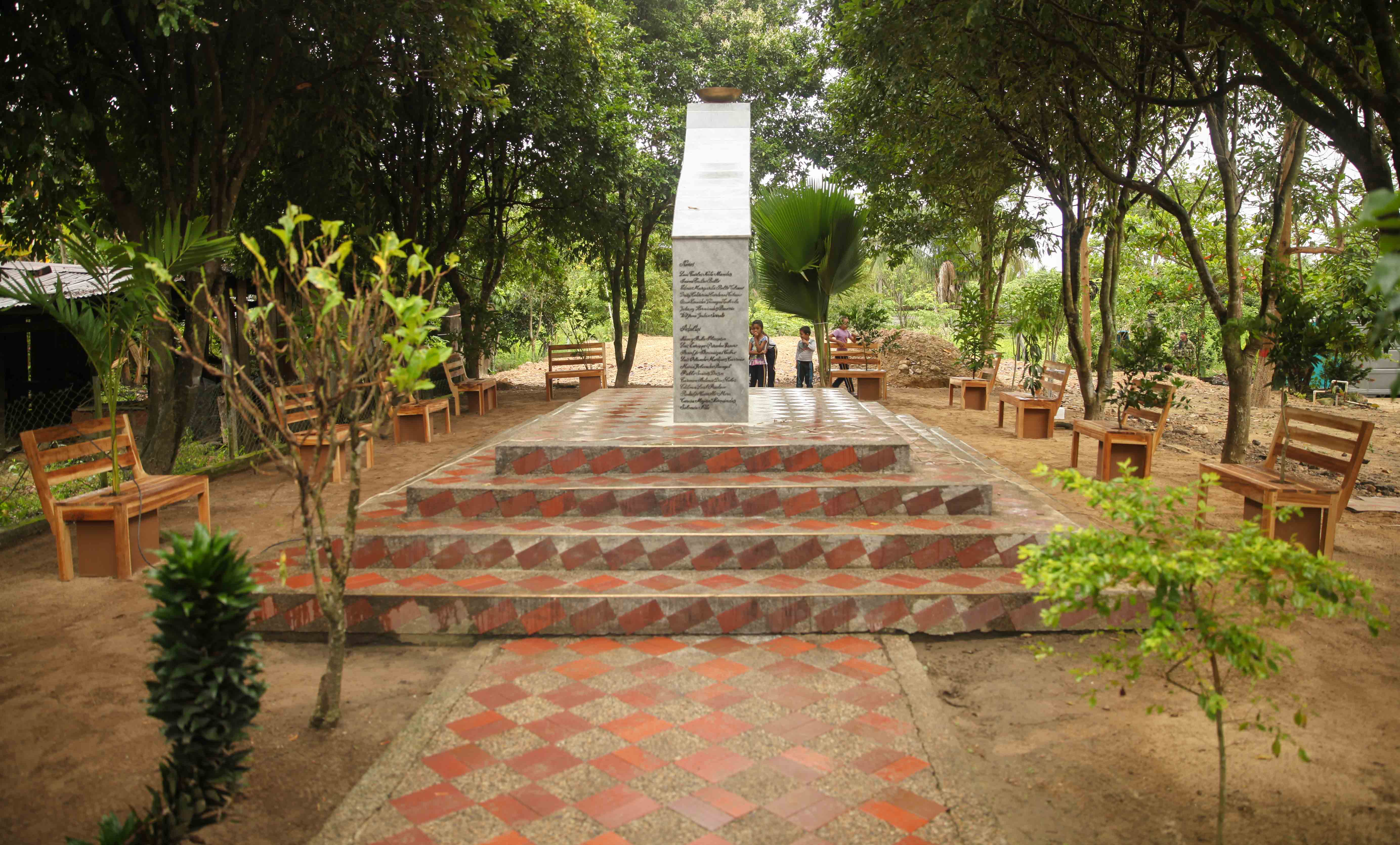 En Santo Domingo, el artista Leonel Vásquez, con la participación de la comunidad, creó un bosque sonoro de la memoria formado por 17 árboles frutales y ornamentales situados cerca del monumento construido en 1999 para conmemorar a las víctimas de la masacre. En la Figura 1, se ve que cada árbol se encuentra en una silla doble, dejando un espacio vacío que invita a los actores políticos y sociales a acercarse a escuchar a los ausentes. Como se puede ver, estas sillas se ubicaron alrededor del monolito con los nombres inscritos de cada una de las víctimas para recordarle al público la importancia de su papel en la búsqueda de la verdad y la reparación de los daños causados (Universidad Externado de Colombia, 2017).