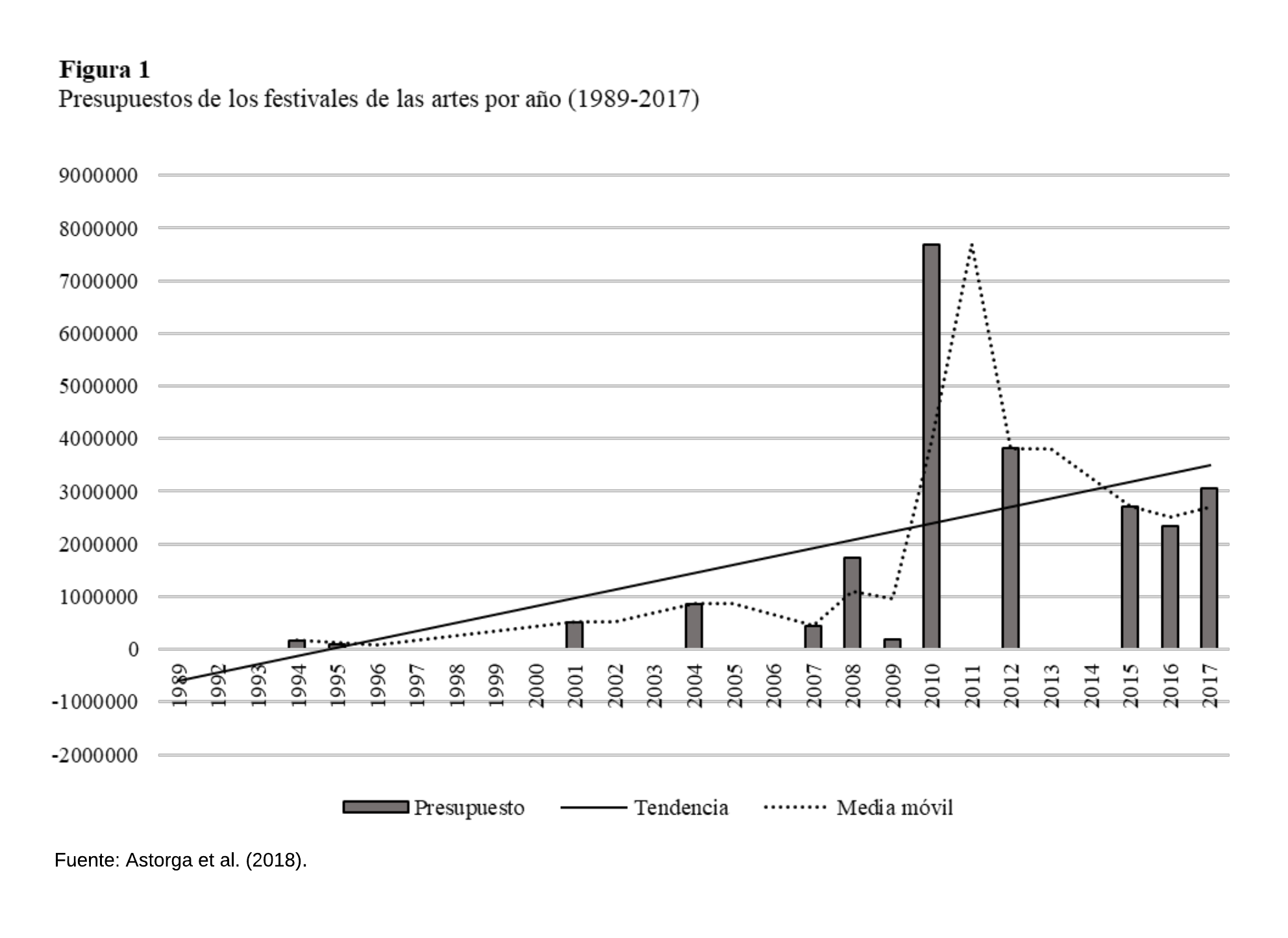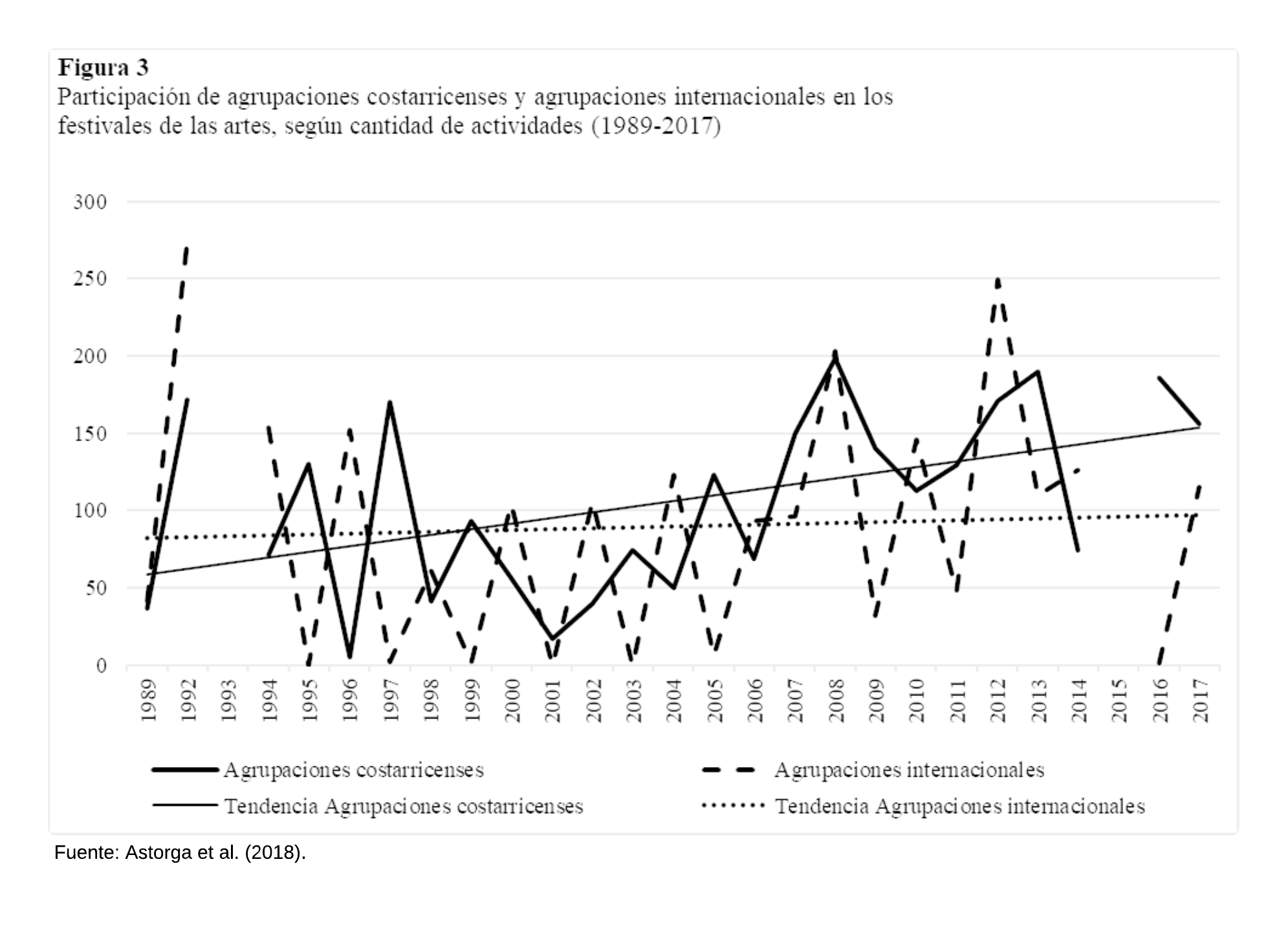 Astorga Sánchez y otros (2018)Un tercer resultado es que, desde el 2012, el Festival de las Artes entró en un proceso de relativa estabilidad, en el cual se observa un crecimiento regular del presupuesto destinado a la organización y la programación. Asimismo, pese a que el Festival del 2016 se llevó a una localidad fuera de San José, mantuvo un presupuesto similar al invertido en los FIA. Esto lleva a suponer que, al observar el comportamiento en todo el período, los festivales no son organizados homogéneamente ni siquiera en una misma administración presidencial –donde generalmente se encuentran los mismos jerarcas al mando–, sino que son organizados individualmente, año tras año, como borrón y cuenta nueva. Esas fluctuaciones se han trasladado a la programación y a las tendencias artísticas de los festivales.