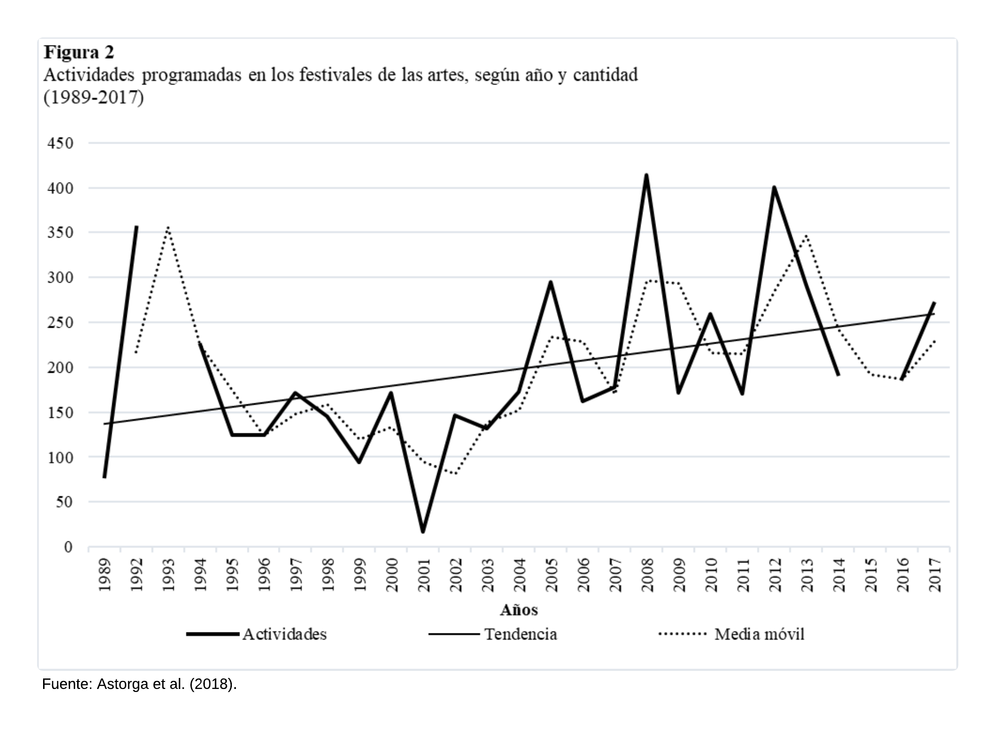 De esta manera, se puede señalar que el teatro es la principal actividad artística del Festival de las Artes, lo que guarda una relación estrecha con su origen. Ahora bien, en 1997 y entre 2011 y 2014, la música, por medio de las tarimas de conciertos, se convirtió en la principal actividad de los festivales. Asimismo, la danza, ubicada en tercer lugar dentro de la programación, tuvo una mayor importancia en 1992, 2008 y 2014. Por último, las proyecciones de cine y audiovisuales alcanzaron un lugar de privilegio en 1996, 2008 y 2016-2017.