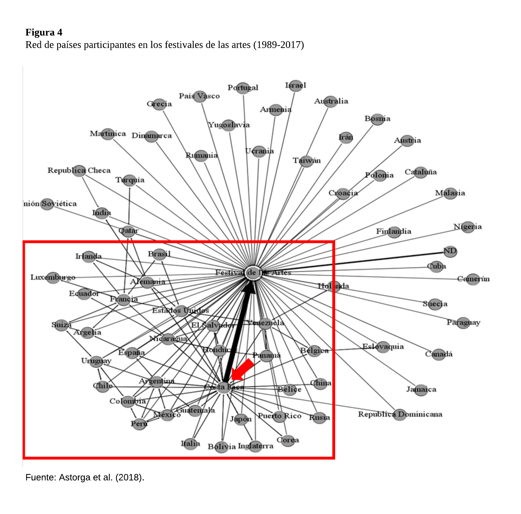 Por otro lado, como muestra cada una de las redes de países conformadas en torno a los festivales11, Costa Rica ha aportado la mayor cantidad de agrupaciones en todo el período de estudio, tanto en los FNA como en los FIA; únicamente en el FIA de 1996 Costa Rica no aportó la mayor cantidad, cediendo ese lugar a España, un aliado histórico del Festival. Pese a que la programación de los FNA ha contado principalmente con agrupaciones costarricenses, hubo importantes esfuerzos en los festivales de 2007, 2011 y 2013 por diversificar la programación con artistas internacionales. Por otra parte, la Figura 4 muestra otra particularidad de la programación de los festivales: los constantes esfuerzos por coproducir espectáculos entre agrupaciones nacionales y extranjeras; muestra de ello son los festivales de 1992, 2002, 2006 –siendo este en el cual se realizaron la mayor cantidad de coproducciones–, 2007, 2008, 2010, 2012 y 2017. Esto es importante porque ha permitido una dinámica de transmisión de ideas y saberes en un circuito del arte global, la cual ha tenido al país como nodo central. El recuadro rojo de la figura contiene los países a los cuales pertenecen las agrupaciones artísticas que han realizado coproducciones. Como se observa, Costa Rica (señalado con la flecha roja) se encuentra en el nodo central y ha intercambiado con una enorme cantidad de países. Lo anterior también representa una característica del mercado del arte propiciado por el festival.
