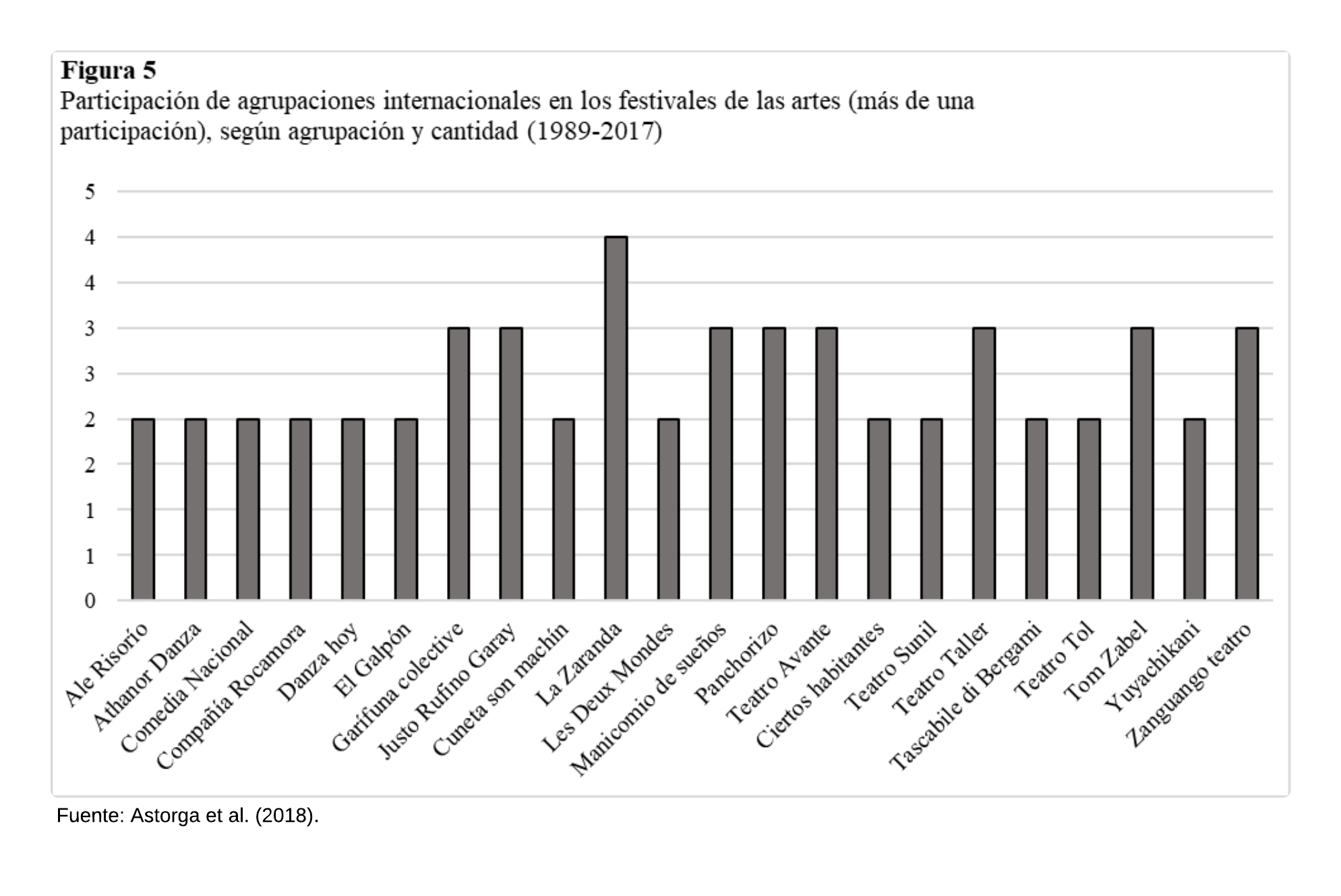 Lo señalado permite concluir que las agrupaciones costarricenses sí han tenido un espacio abierto y significativo en los distintos festivales, lo que se ha convertido en un verdadero mercado para las agrupaciones artísticas del país, el cual ha conllevado la creación de espacios para el arte y, como consecuencia, la competencia por ellos, todo esto propiciado por una política cultural concreta. Teniendo esto en cuenta, ¿cuántas de esas agrupaciones se presentan constantemente en los festivales? Como se muestra en la Figura 5, algunas agrupaciones internacionales se han presentado en más de una ocasión: resalta el caso de La Zaranda (España), que se presentó en cuatro ocasiones y otras, como Garífuna Collective (Honduras), Tom Zabel (Austria) y Manicomio de sueños (Colombia), en tres ocasiones. No obstante, esto no quiere decir que el mercado internacional del Festival de las Artes está acaparado por algunas agrupaciones, ya que, en un período de 28 años, cuatro presentaciones representan muy poco.