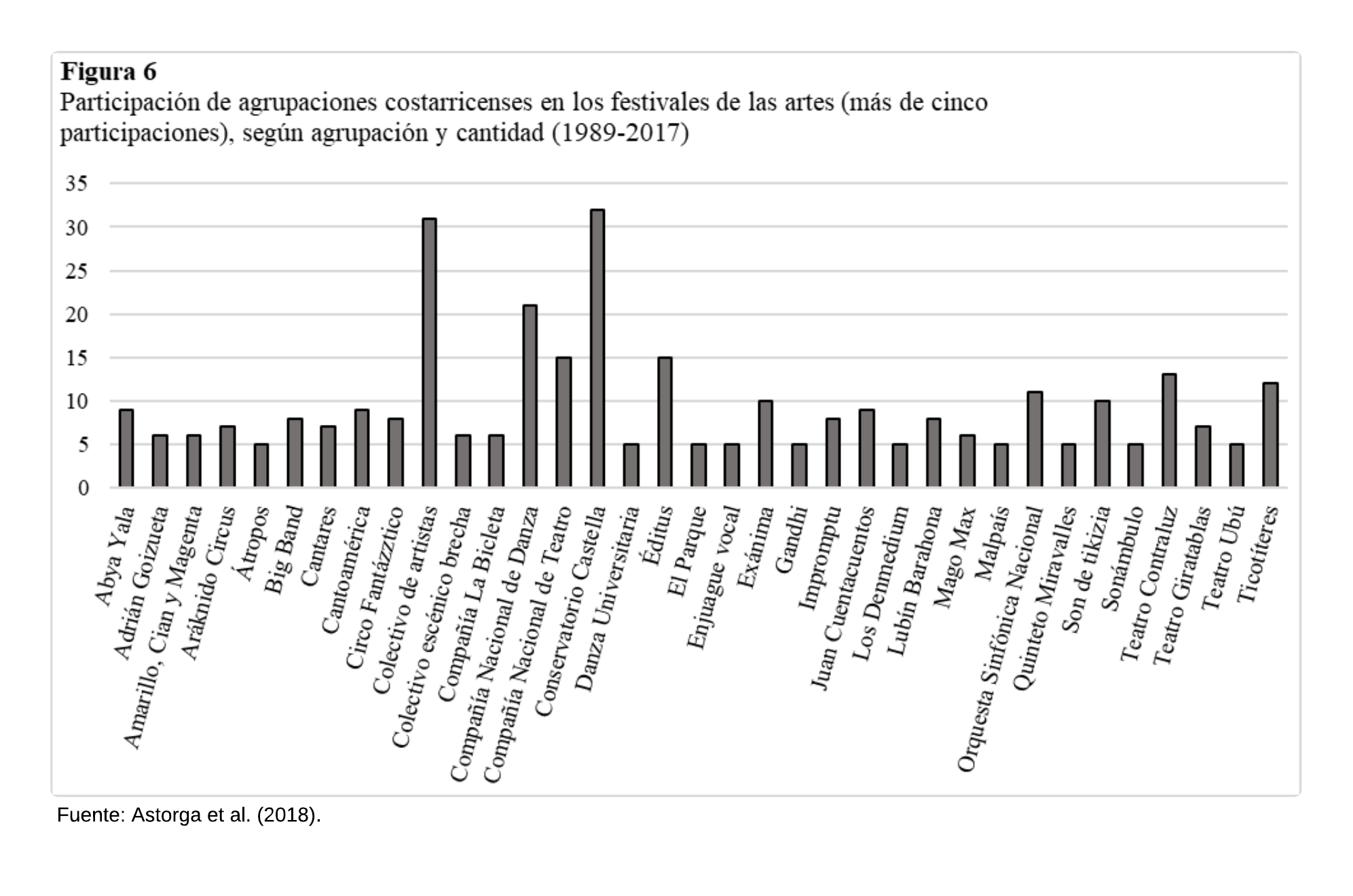 Lo contrario sucede con el mercado costarricense, en el cual se encuentran agrupaciones que se han presentado en más de 30 ocasiones. La Figura 6 muestra que las agrupaciones que dependen del Estado, como el Conservatorio Castella, la Compañía Nacional de Danza, la Compañía Nacional de Teatro y la Orquesta Sinfónica Nacional, han encontrado en el Festival de las Artes un espacio constante para la exposición de sus artistas. Además, muestra que ha sido un espacio idóneo para que los artistas se unan bajo la figura del “colectivo” y asuman presentaciones conjuntas. Junto a ello, el gráfico muestra que agrupaciones particulares, como Éditus, Teatro Abya Yala, Cantoamérica, Exánima, Lubín Barahona, Ticotíteres, Juan Cuentacuentos, Son de Tikizia y Malpaís, han hecho del festival su principal vitrina de exposición y han obtenido el beneficioso respaldo –y la legitimación oficial– del Estado costarricense.
