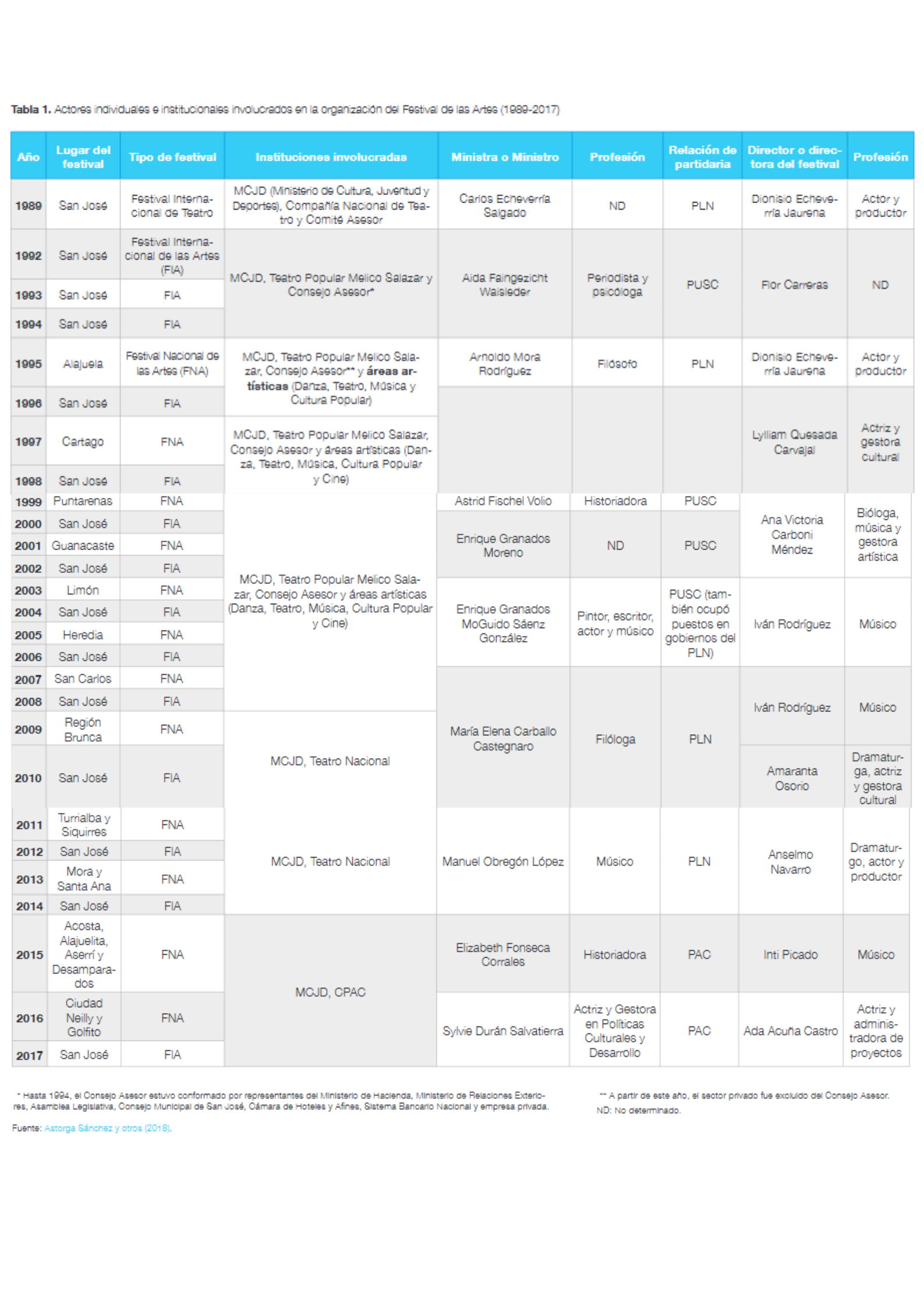 La Tabla 1 (que se presenta a continuación) muestra a estos actores, con el propósito de visualizar la conformación organizativa del Festival de las Artes en su trayectoria histórica. Los siguientes apartados profundizarán en el impacto de esta normativa y estos sectores en la definición de los modelos de programación que han marcado la historia del festival.