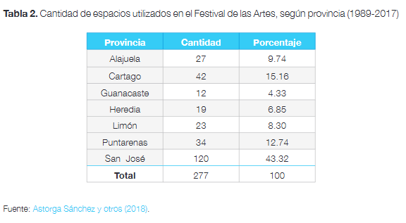 En el período comprendido entre 1989 y 20179, el Festival de las Artes se realizó en las siete provincias del país, con un total de quince festivales internacionales y doce nacionales, con lo cual se ha creado un mercado del arte en Costa Rica. Como se observa en la Tabla 2, la capital, San José, es el lugar que más espacios ha utilizado en la historia del Festival de las Artes, con un 43.3 % del total. En los ciento veinte espacios utilizados en este lugar, se han realizado tres mil espectáculos, una cantidad sumamente elevada si se compara con el resto de las provincias. Tal disparidad se debe a que, hasta la fecha, en la capital se han realizado todos los Festivales Internacionales de las Artes, los cuales han contado con presupuestos más elevados que permitieron ampliar considerablemente la programación artística.