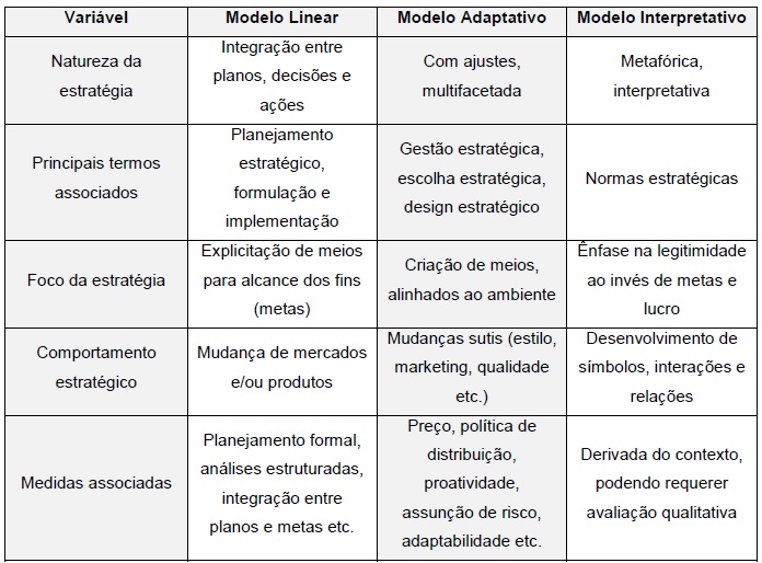 Os modelos Adaptativo e Interpretativo têm base em premissas e elementos conceituais identificados na literatura sob esta mesma nomenclatura. Já o modelo Linear, denominado por Chaffee (1985), adota este termo como sinônimo de racional por conotar a ação metódica, intencionada e sequencial envolvida no planejamento estratégico, segundo a perspectiva funcionalista. As principais características dos três modelos de estratégia de Chaffee (1985) estão resumidas na Figura 1.