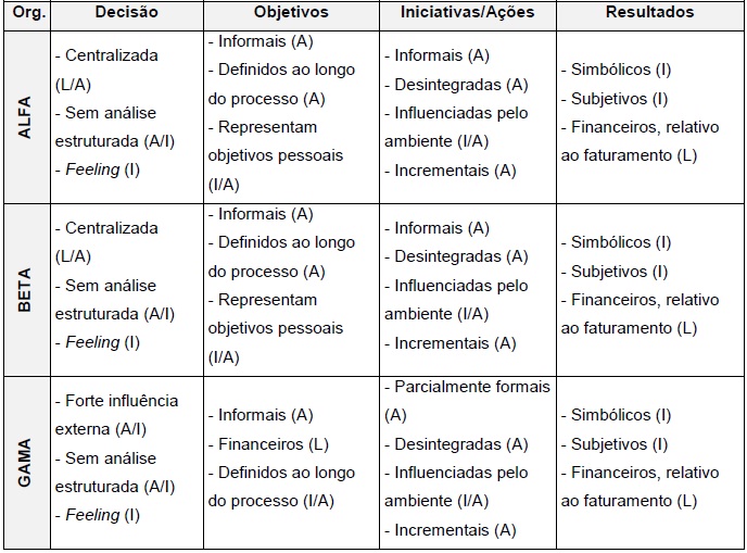 Na fase decisão buscou-se identificar como aconteceram as escolhas dos tomadores de decisão, podendo ser baseadas em análises estruturadas ou intuitivas, ou ainda, decisões coletivas ou individuais. Na fase objetivos, buscou-se verificar como se caracterizaram os objetivos almejados e se foram definidos previamente, constituídos ao longo do processo ou se simplesmente emergiram. Na fase iniciativas/ações buscou-se caracterizar como as ações decorrentes de decisões estratégicas foram desenvolvidas, se de forma integrada, com base em análises formais e planos previamente elaborados, ou foram sendo incrementadas ao longo do processo como resultado do aprendizado obtido. Por fim, na fase resultados verificou-se se o desempenho foi coerente com os objetivos previamente estabelecidos e como foram acompanhados (formal ou informalmente).