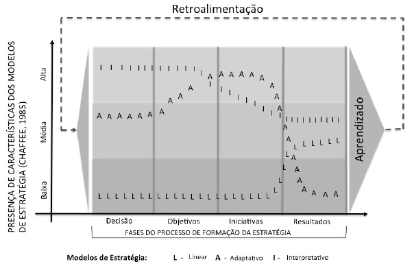 As características encontradas em cada uma das fases do processo de formação de estratégias nas organizações investigadas permitiram identificar uma espécie de dinâmica da presença de características racionais, interpretativas e adaptativas neste processo, que é demonstrada por meio da Figura 3.