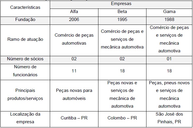 As empresas foram selecionadas a partir de três critérios principais: 1) porte (pequena empresa), segundo a classificação do Serviço Brasileiro de Apoio a Micro e Pequena Empresa (SEBRAE, 2010); 2) ramo de atuação semelhante, ou seja, comércio de peças e serviços automotivos; e 3) localização geográfica (Região Metropolitana de Curitiba, Paraná). Para preservar as identidades das organizações, elas são identificadas ao longo deste estudo como Alfa, Beta e Gama.